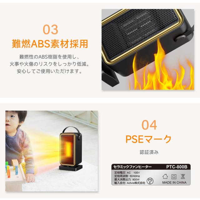 3. 直火を使わない安心設計:PTCセラミックで発熱し温風を送るため、ガスや石油を使用せず直火が一切ありません。室内の空気を汚さず、換気のしにくい空間でも快適に使用可能です。