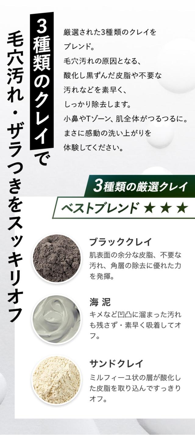 泡立て不要で、毎日簡単毛穴ケアできるジェル洗顔。厳選配合された3つのクレイが気になる毛穴汚れを吸着オフ。使い続けることで、毛穴汚れを落として蓄積を防ぎ、ヨーグルトエキス、コメ由来乳酸菌がうるおい環境を整えます。日々の洗顔で、触れたくなるようなみずみずしいつるすべ肌へ。 *ラベンダー油・ローズマリー葉油(整肌剤)がほのかに香ります。