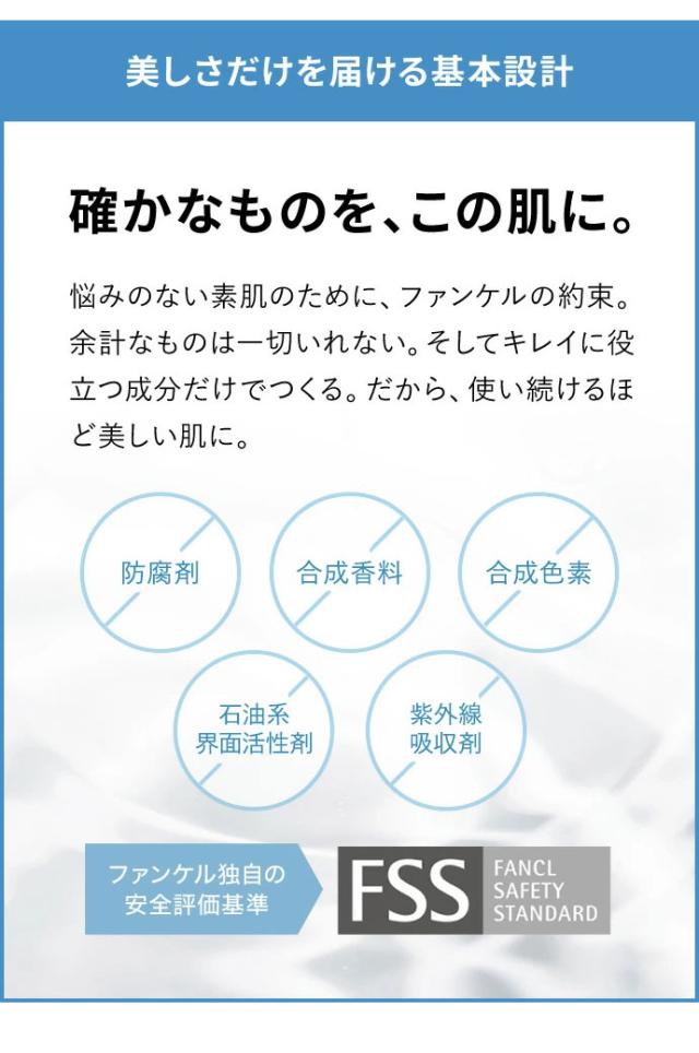 ファンケルの無添加 │ 防腐剤・合成香料・合成色素・石油系界面活性剤・紫外線吸収剤を一切使っていません。※弱酸性、製造年月日入。