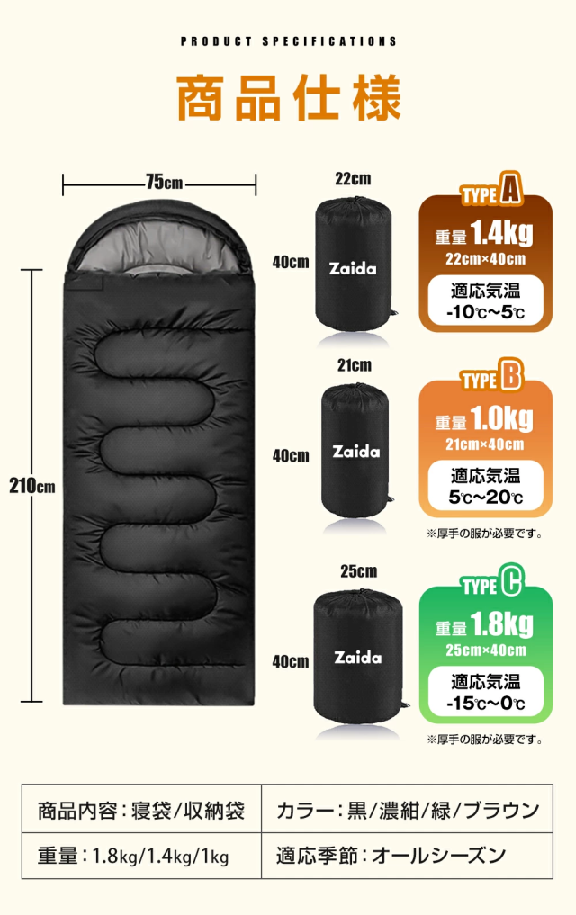 寝袋 封筒型 シュラフ 軽量 洗える 冬用 夏用 ねぶくろ 保温 耐寒 1.8Kg 1.1Kg 1.4Kg 防水 暖かい コンパクト アウトドア キャンプ 登山 防災用 布団 丸洗い可能 収納袋付き オールシーズン