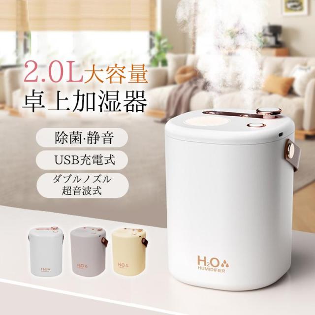 加湿器 小型 卓上 ミニ加湿器 超音波 卓上加湿器 空気清浄機 大容量 2L USB充電式 静音 除菌 コードレス 上部給水式 ダブル噴霧 オフィス 部屋 寝室 車用 乾燥対策 秋冬 ギフト プレゼント