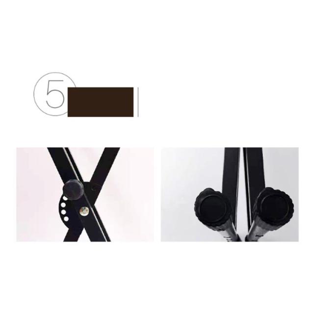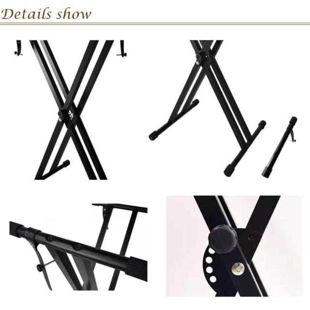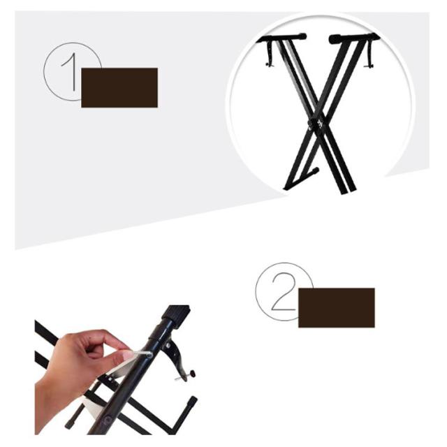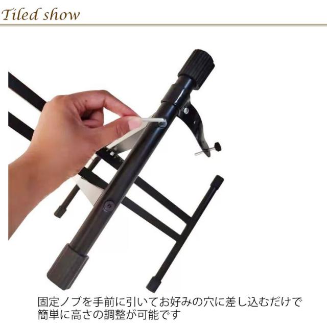 | 7段階調節 キーボードスタンド 場所を取らない折りたたみ式 電子ピアノに傷つくにくいコム付き 固定ノブを手前に引いてお好みの穴に差し込むだけで簡単に高さの調整が可能です | |