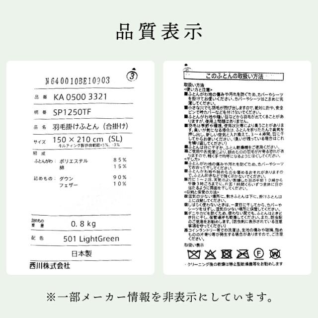 [keyword | 羽毛掛け布団 合掛け シングルロング 150×210 日本製 西川 ポーランド産 ホワイトダック ダウン90 フェザー10 0.8kg 立体キルト L字マチ ダウンプルーフ バイオアップ 抗菌 清潔 透湿 保温 軽量]