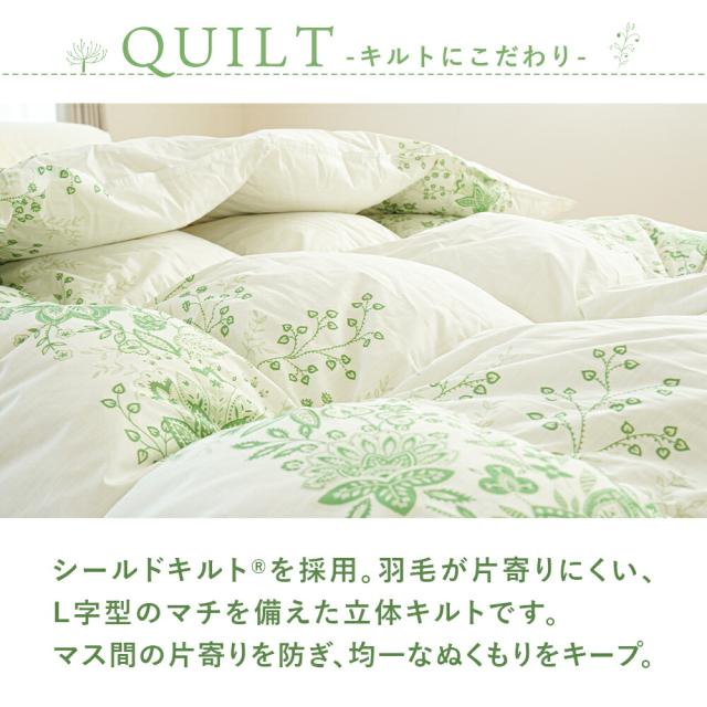 DOWN -ダウンにこだわり- ポーランド産ホワイトダックダウン使用。伸びやかに育った成熟ダウンで、保温・透湿・純白度・耐久性に優れます。 西川だけの バイオアップ? 加工西川は羽毛を徹底洗浄。選別後に「加湿乾燥」「冷却除塵」を施し、軽く暖かくクリーンに。バイオアップ加工でほこり約26%削減。 西川の 清潔・安心ダウン高機能分散加工を施した羽毛。ウイルス・菌・ニオイ成分を拡散し、清潔で快適にお使いいただけます。 QUILT -キルトにこだわり-シールドキルト?を採用。羽毛が片寄りにくい、L字型のマチを備えた立体キルトです。マス間の片寄りを防ぎ、均一なぬくもりをキープ。 立体キルト羽毛の良さを引き立てるマチのあるキルティング。肌沿いが良く、暖かい空気を逃がしにくいので快適。マチで小部屋をつくり羽毛の片寄りを抑制。表裏を密着させない特殊縫製で、ふっくら感が続きます。 CLOTH -生地にこだわり-軽さと張り感に自信。それでも羽毛は通しません。 ダウンプルーフ加工 羽毛を包む特別な生地羽毛の飛び出しを防ぐダウンプルーフ加工生地。羽毛は繊細で吹き出しやすい。生地に熱と圧力をかけて織り目を密にするダウンプルーフ加工で、通気性を保ちながら羽毛の吹き出しを抑えます。 ・西川製品西川は、日本有数の寝具メーカー。1566年創業。450年という長い歴史があり、その中で培ってきた伝統や技術に準ずる品質の高さは類を見ません。安心できる寝具を選びたいのならメーカーで選んでみるのも◎ |