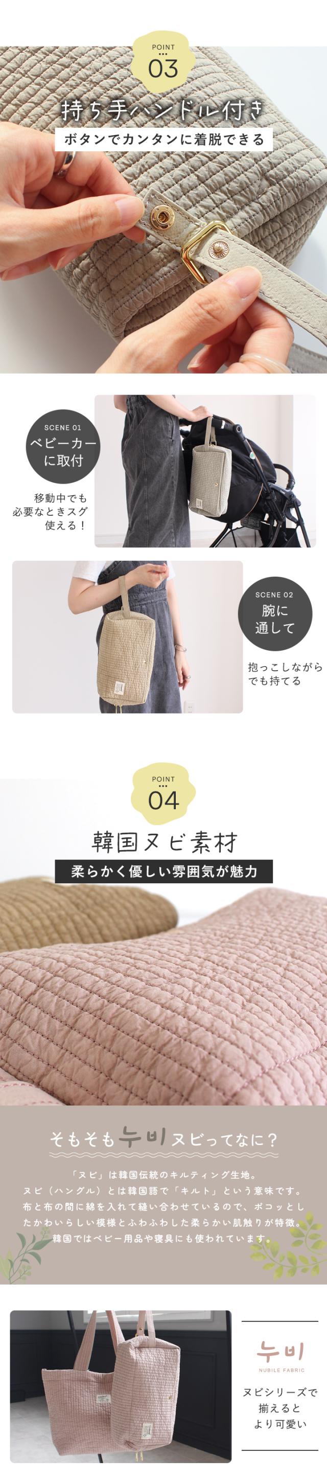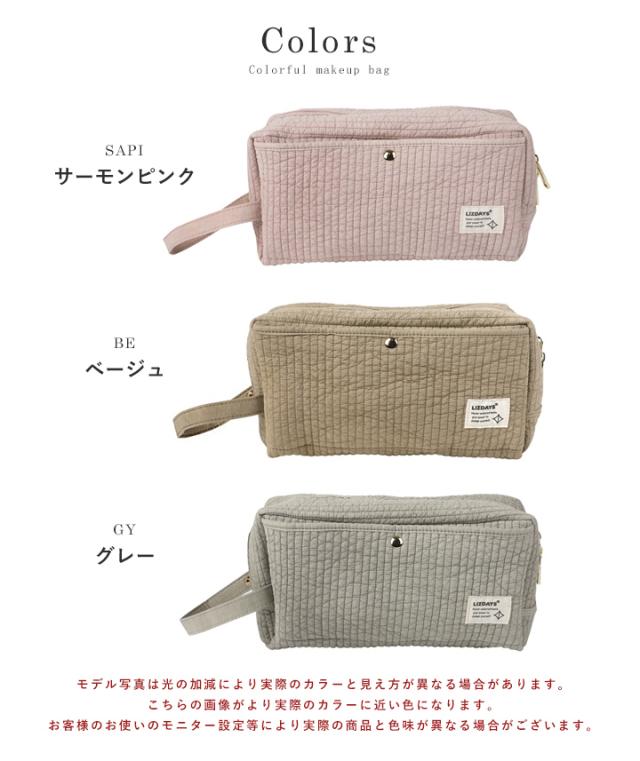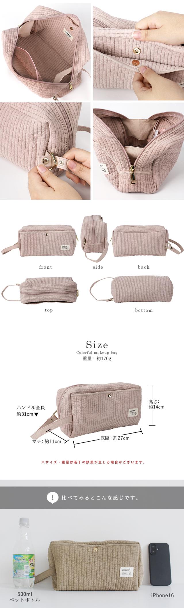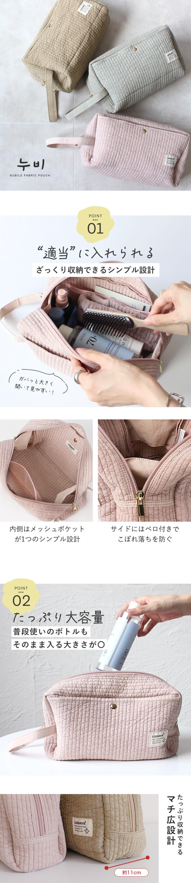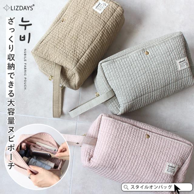 なんでもポンポン入る! 大きめが便利な韓国ヌビ生地マルチポーチ。 旅行用に、おむつポーチに、バッグインバッグに いろんな使い方ができる大容量ポーチ。 内側はメッシュポケットが1つとシンプル設計。 そのまま適当にポイポイっと入れられる! 大雑把だけどカバンの中はすっきりさせたい、 そんな大荷物派の方にぴったりなポーチ! 面倒な旅行の荷造りやサウナなどのスパ通いにも 普段使いのボトルもそのまま収納できる大きいサイズ。 ママさんにはおむつやおしり拭きシートなどを たっぷり収納可能。ボタンで簡単着脱できるハンドルは ベビーカーに吊り下げられておでかけに便利。 ぽこぽことしたキルティングが可愛いヌビ生地。 軽量で何も入れていない状態はぺったんこに。 |