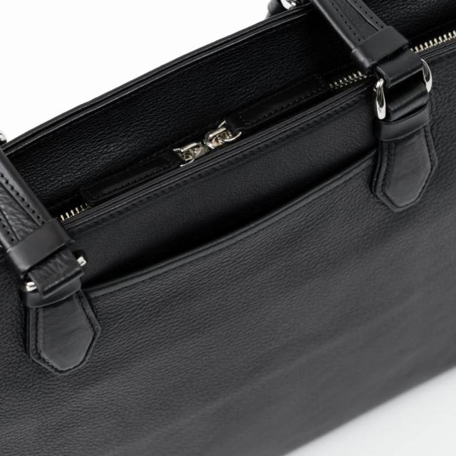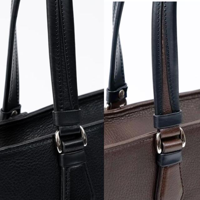 | ビジネストート【GRAIN2.0】 上質素材で仕立てたビジネスカジュアルトート 幾多のレザービジネスバッグを世に送り出してきたFIVE WOODSが、多様化・カジュアル化する現代のビジネススタイルに応える、新しいビジネスバッグ。ビジネスシーンに相応しいきちんとした上質感を備えながらも、アクティブで軽やかなスタイルにも自然に溶け込む絶妙なバランスに仕立て上げました。 素材や食品などライフスタイルにおいて、より自然なものや長く使えるものを選ぶ方が多くなった現代、GRAINシリーズの革もよりナチュラルなものに変更し、長年使った際により愛着が湧く経年変化を愉しめるようにグレードを向上。前モデルから引き継いだ機能性や使い勝手はそのままに、素材を時代にあわせてアップデートしました。 柔軟性に富み実用性の高いクロム鞣しと、堅牢さと豊かな経年変化を特徴とするタンニン鞣し、両者のメリットを兼ね備えた混合鞣しを施し、革の自然な風合いを味わえるよう素材本来のシボを活かしたナチュラルな表情に仕上げています。視覚的にも触覚的にも革ならではの質感をよりダイレクトに感じることができ、使うほどに色艶が増す美しい経年変化を味わうことができます。 肉厚な素材を活かした柔らかなフォルムのトートバッグにはA4ファイルや13インチノートPCが余裕で収まり、ビジネスシーンに適した収納力を備えます。前後に配したサイズの違うポケットは小物を効率よく収納でき、どちらを正面にしても持てるデュアルフェイスデザイン。強度を高めるため要所に施したパイピングがさりげないアクセントになり、引き締まった印象を与えます。握りやすいハンドルは長めにとり、アウターの上からでも肩がけしやすいよう設計。ビジネスの機動力を向上させます。 GRAIN 2.0 多様化する現代のビジネススタイルに応える、ビジネスバッグの新しいスタンダード。アクティブなビジネススタイルに溶け込む気軽さや機能性を備えながら、確かなつくりと天然素材ならではの上質感も併せ持つ、才色兼備なレザービジネスバッグです。 |