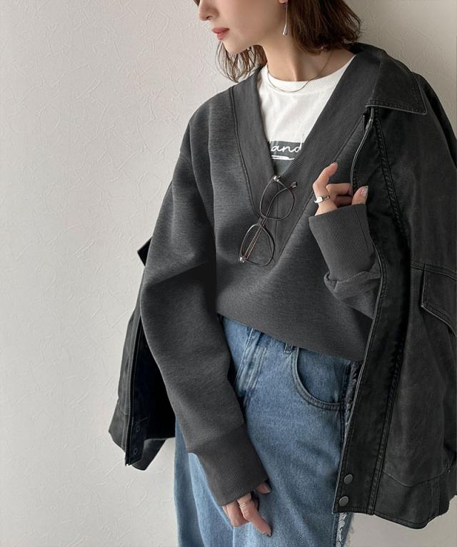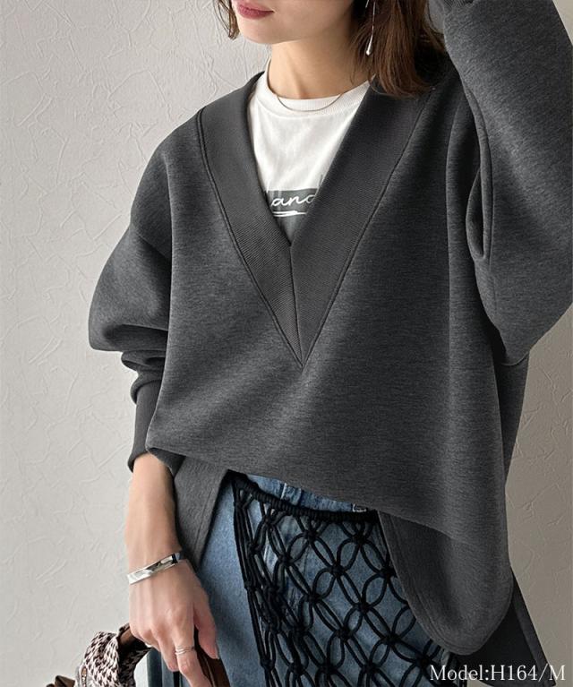立体感のあるリブVネックが顔まわりをシャープに演出◎