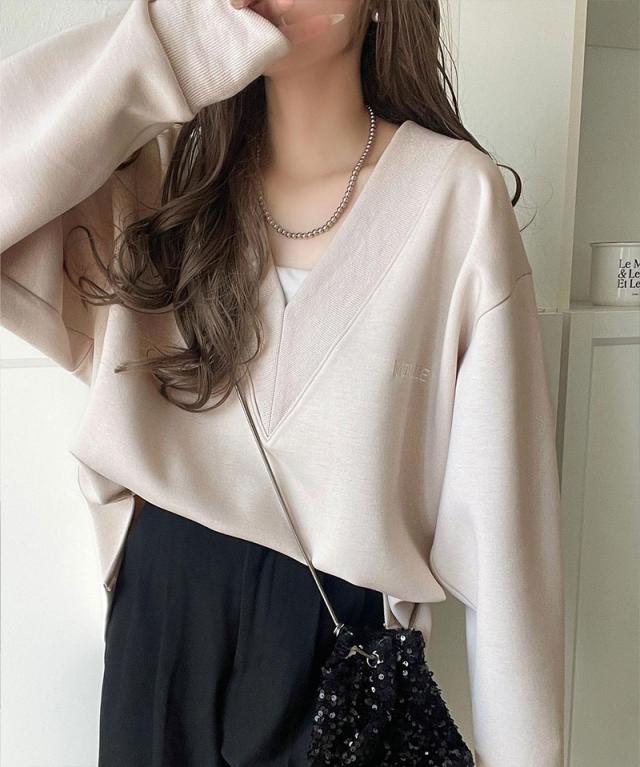 リブ切替を効かせた太めのVネックラインが小顔効果を与えつつ、大人っぽい雰囲気を演出。
