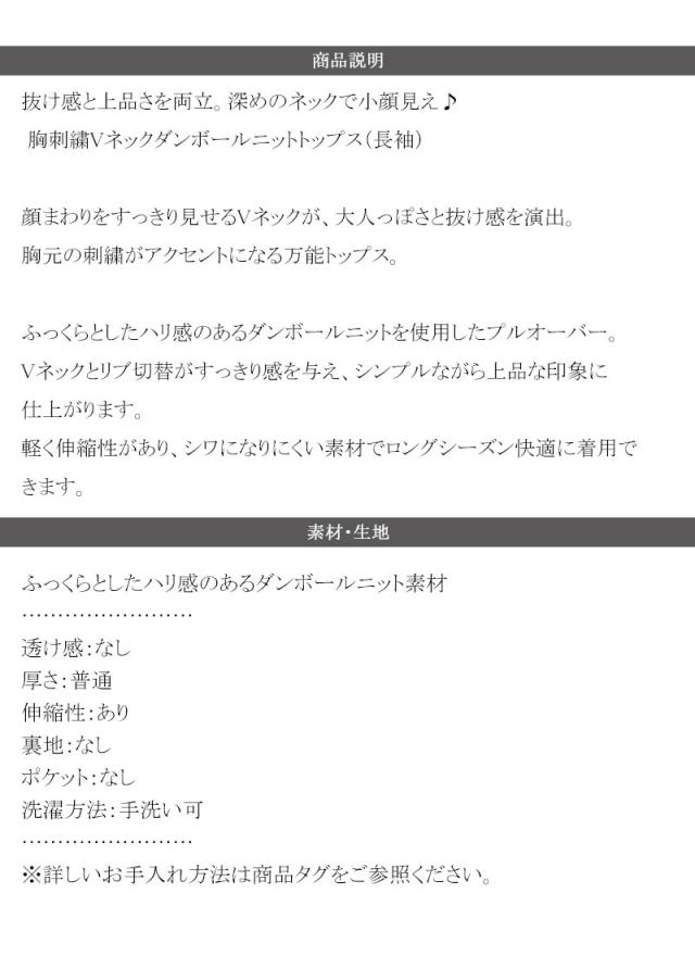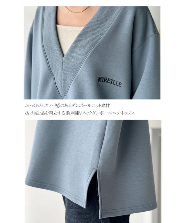 抜け感と品を両立する 胸刺繍Vネックダンボールニットトップス。