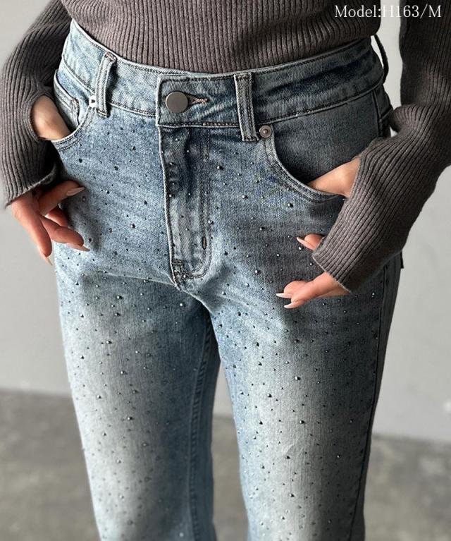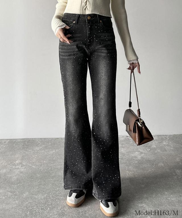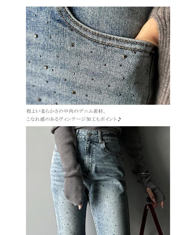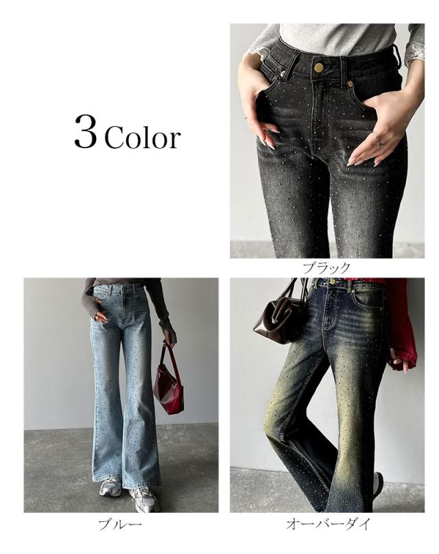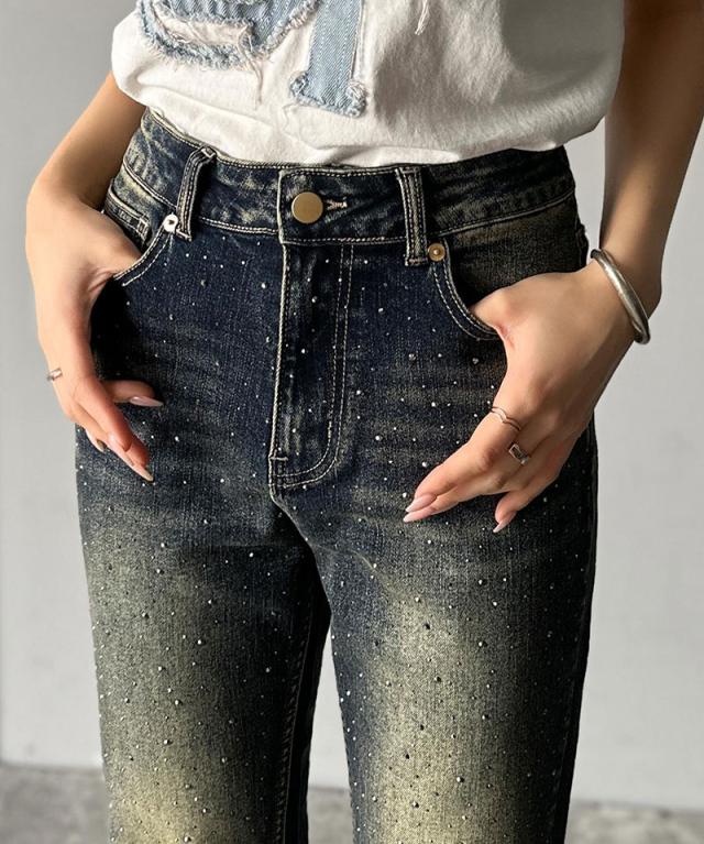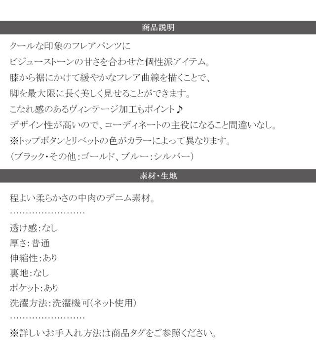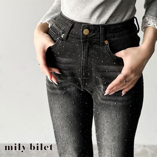 クラシカルエルフ冬新作 mily bilet ボトムス レディース デニムパンツ レディース 大きいサイズ ヴィンテージライク フレア キラキラ ビジューストーン 美脚 ビンテージ風 クール 曲線 脚長 こなれ感 ヴィンテージ加工 カジュアル ガーリー 2025aw mi0909012