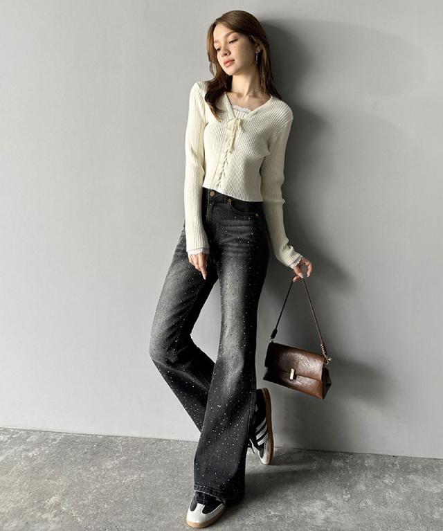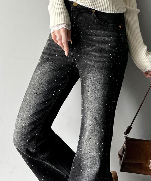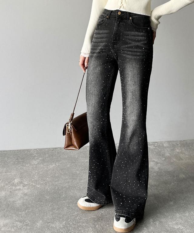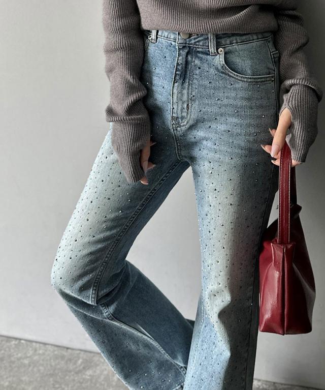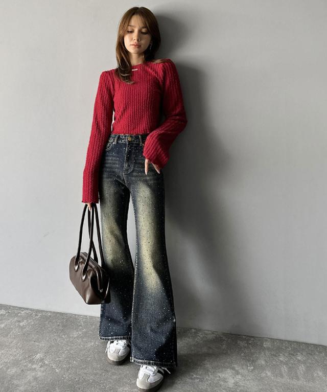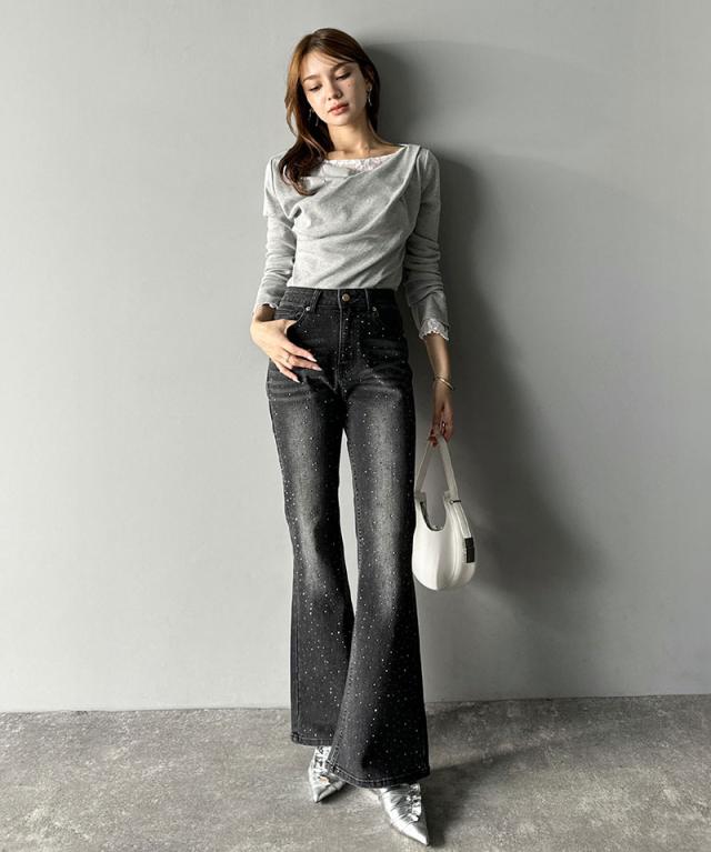 クラシカルエルフ冬新作 mily bilet ボトムス レディース デニムパンツ レディース 大きいサイズ ヴィンテージライク フレア キラキラ ビジューストーン 美脚 ビンテージ風 クール 曲線 脚長 こなれ感 ヴィンテージ加工 カジュアル ガーリー 2025aw mi0909012