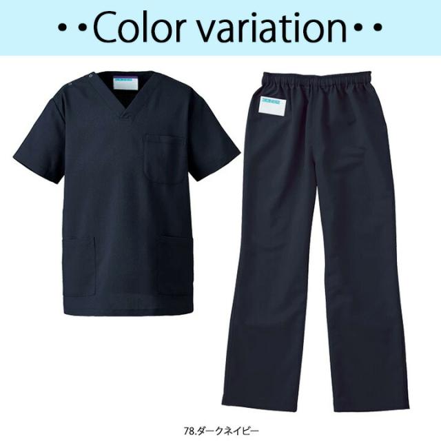 | 仕様 | 【スクラブ】左胸・両腰ポケット付 内側(ネーム)部分にカラーテープ付 【パンツ】右脇(ネーム)部分にカラーテープ付 ウエストゴム仕様(共地ひも入り) |