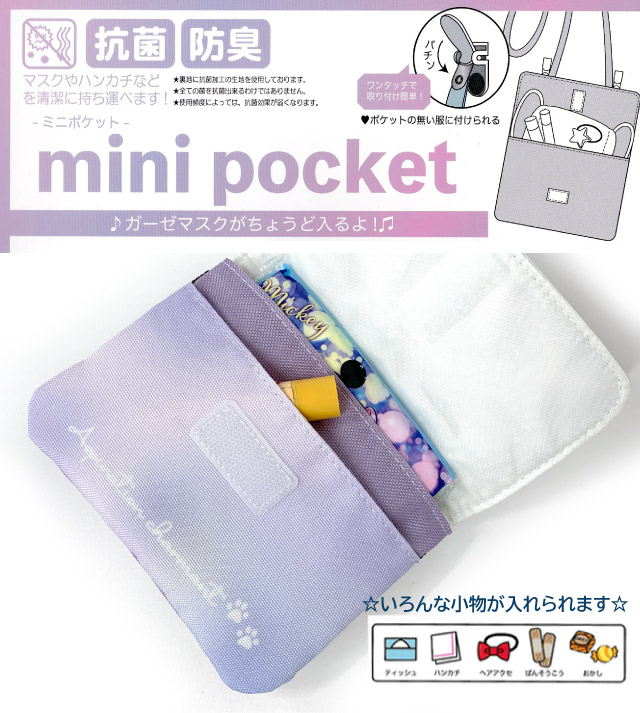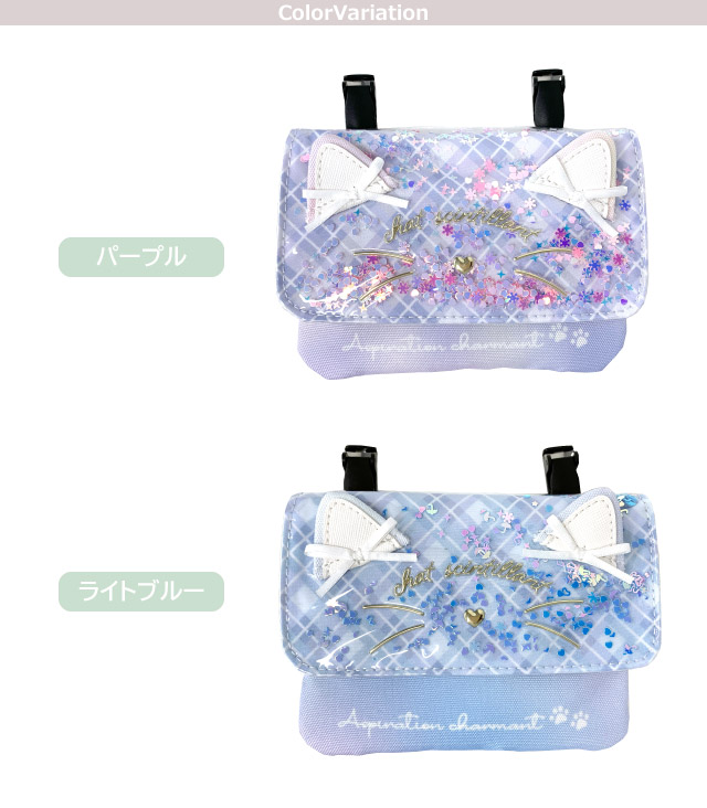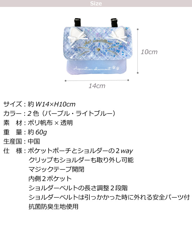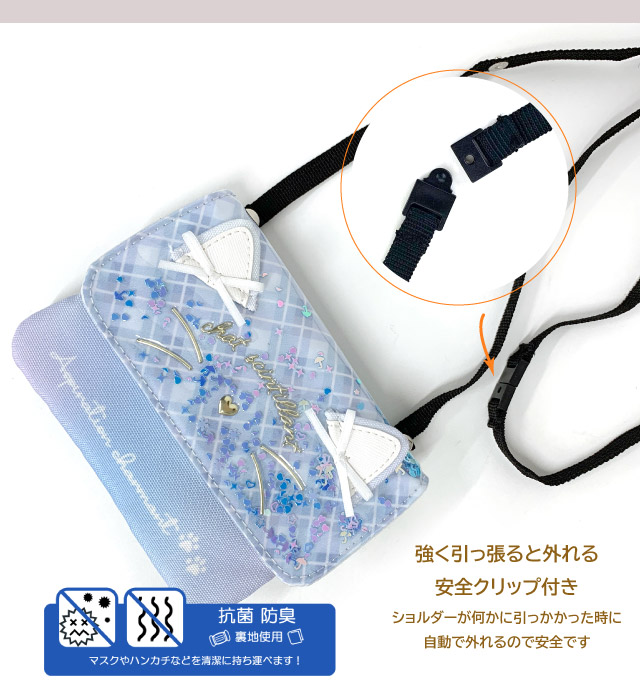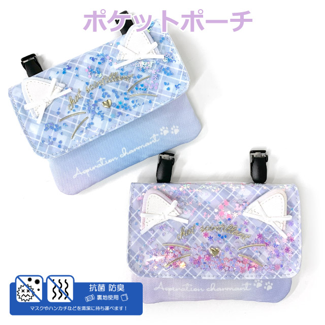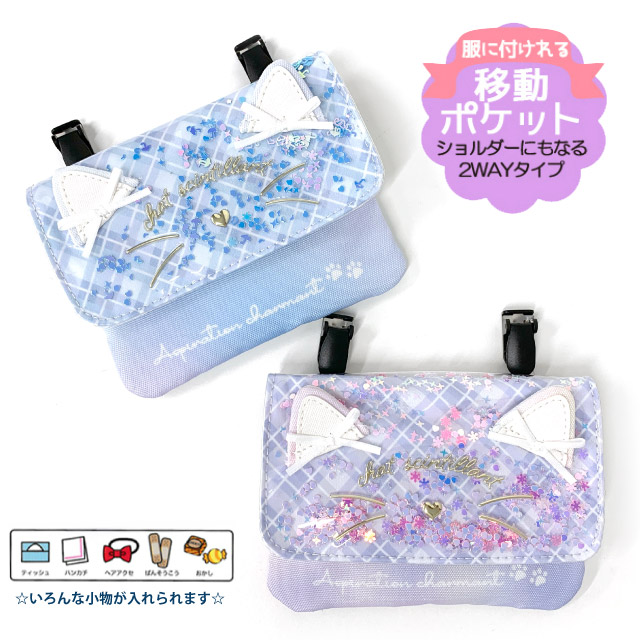 移動ポケット ポケットポーチ 女の子 マルチポケット ネコ シャカシャカ キラキラ リボン ポケット ポーチ クリップ ショルダー ポシェット ティッシュ入れ キッズ 小学生 女子 ジュニア 水色 紫 抗菌 防臭 入園グッズ 入学グッズ 付けポケット 外付けポケット mdb-531