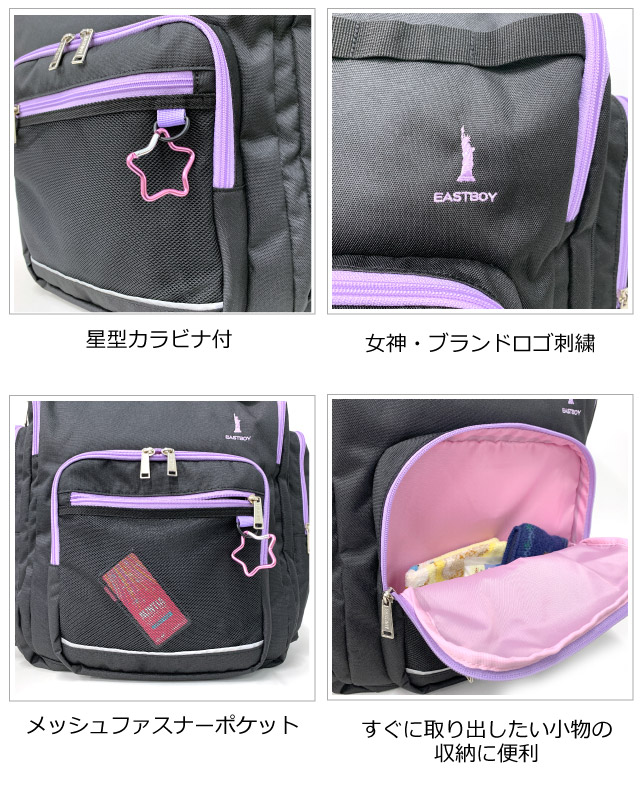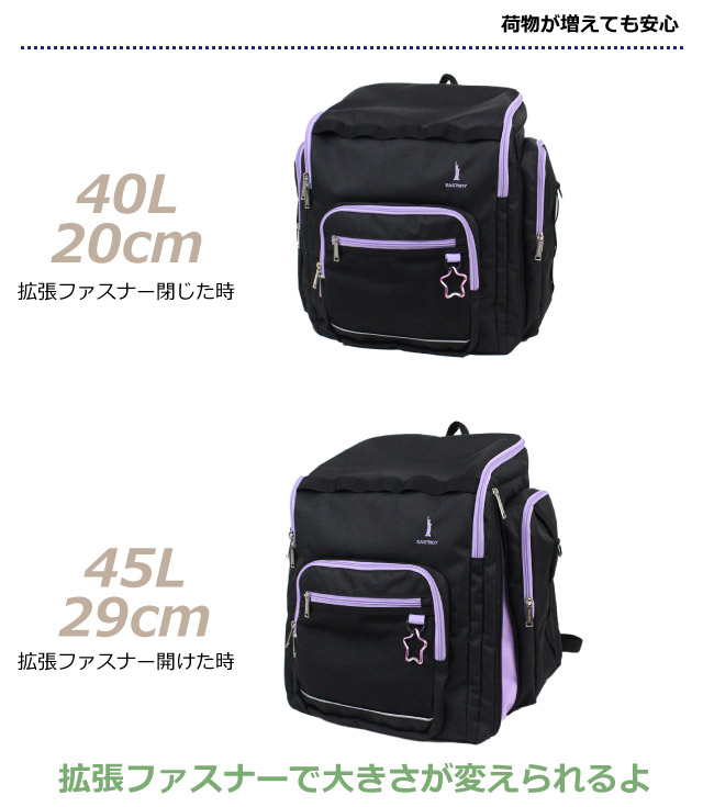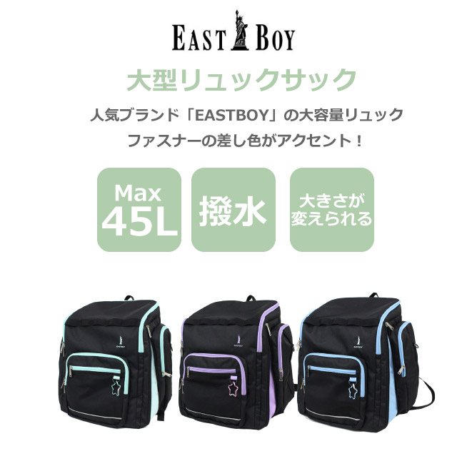 ■イメージ・その他:おしゃれ お洒落 おすすめ 人気 通販 ブランド 大きい 大きめ 大型 大容量 2泊 3泊 可愛い かわいい キュート 胸ベルト 胸バックル ずれ落ち防止 黒 ブラック 紫 パープル ブルー 水色 グリーン 緑 ミント ブランドロゴ EAST BOY イーストボーイ 自由の女神 林間学校リュック 林間学校バッグ マチ拡張 エキスパンド機能 大型リュック 40リットル 45リットル リフレクター 反射材 星型カラビナ 星 スター チェストベルト はっ水 撥水