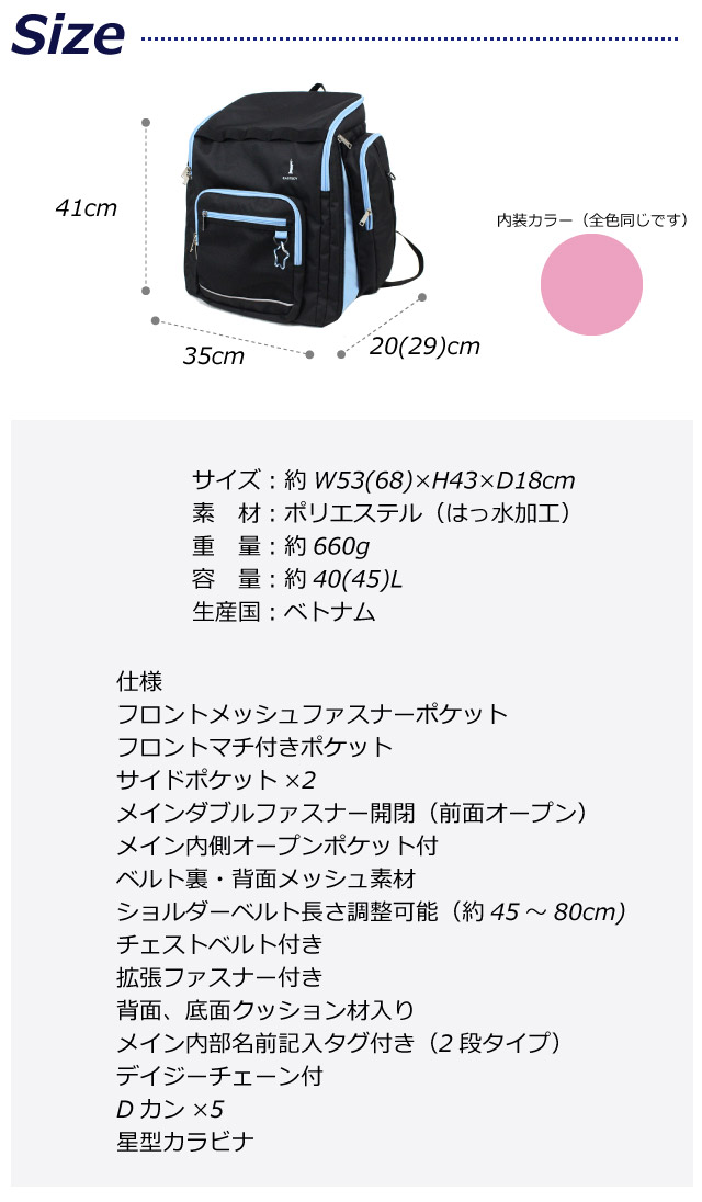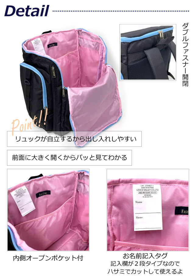 ![]() ![]() ![]() ![]() ![]() ![]() ![]() ![]() ・EAST BOY イーストボーイ 小学生の修学旅行や林間学校に最適なリュックです。マチ拡張機能により、最大45リットルの収納が可能で、2泊から3泊の旅行にも対応します。 撥水加工が施されており、急な雨でも安心です。リフレクター付きで安全性も考慮されています。さらに、ネームタグは2回使用可能で、長く使える工夫がされています。 カラーは人気のパープル・ミント・スカイの3色。星型カラビナがアクセント。小学生女子におすすめです。