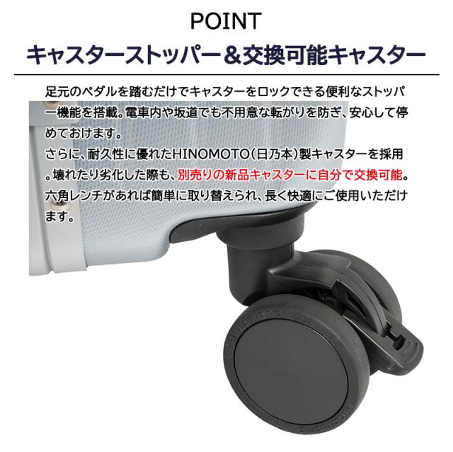 HINOMOTO製ストッパー付き静音キャスターにより、滑らかで安定した走行を実現。