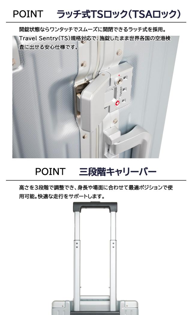 TSラッチロック/HINOMOTO静音キャスター(ストッパー付)/コーナーパッド/ラゲッジフック/両面ディバイダー+クロスベルト