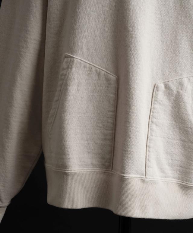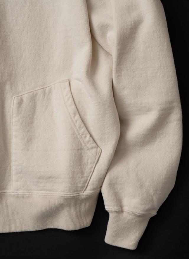 スウェット本体に別パーツとしてフードを縫い付けることで生まれる立体感と陰影が、量産品にはないクラフト感と奥行きを演出します。シンプルながらも存在感があり、着るたびに風合いを増すヴィンテージライクな表情が魅力です。