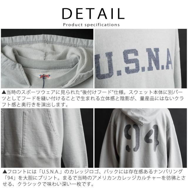 ![]() 製品特徴 ・後付けフード(after hood):当時の製法を忠実に再現したクラシック仕様 ・前後プリント入り:U.S.N.A.ロゴとナンバリング「94」でアメリカンヴィンテージを表現 ・染み込みプリント採用:風合い豊かに経年変化していく、自然な仕上がり ・太番手スラブ糸使用:表情ある生地感とドライな肌触り ・ヘヴィーオンス生地:厚みのある素材感と、着用時の立体的なシルエット ・MADE IN JAPAN:国内工場による丁寧な縫製と仕立ての良さ |