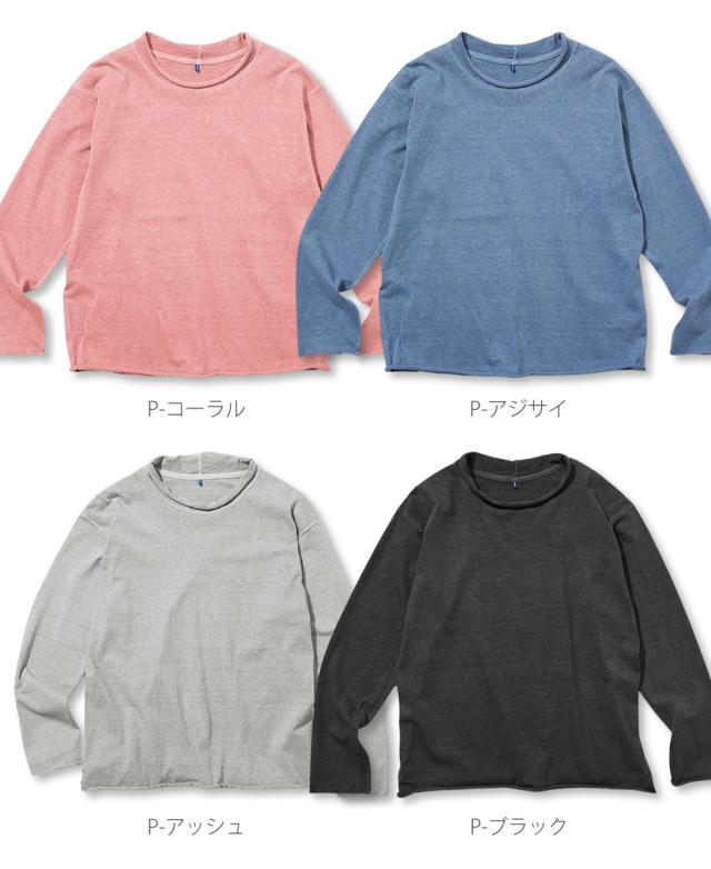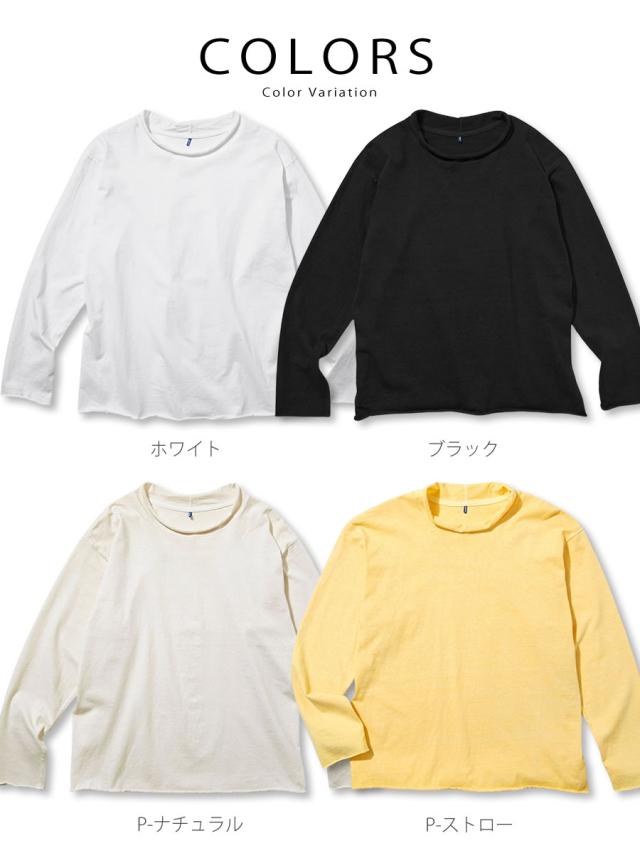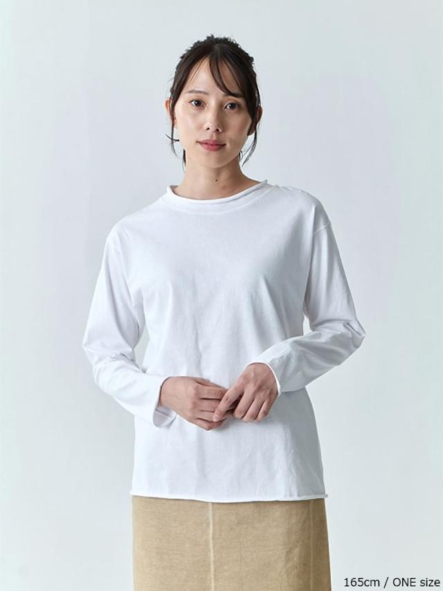 適度にゆとりを持たせたシルエットに、首、袖、裾はカットオフ&ロックステッチ仕様でナチュラルにクルクルと丸まったラフなデザインに仕上げた、ほど良く肩の力の抜けたリラックス感のある表情が何とも言えないウィメンズ用カットソーです。