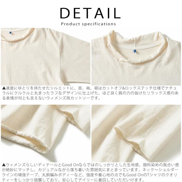 ネック〜ショルダーラインの補強テープ、丸胴編みボディーなど、強度や着心地の点でもGood OnのTシャツのクオリティーをしっかり踏襲しており、安心してデイリーに着回していただいけます。