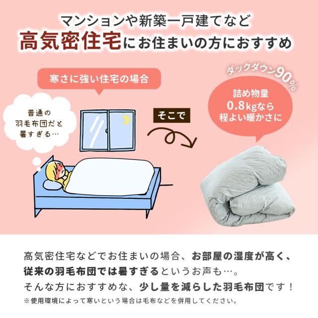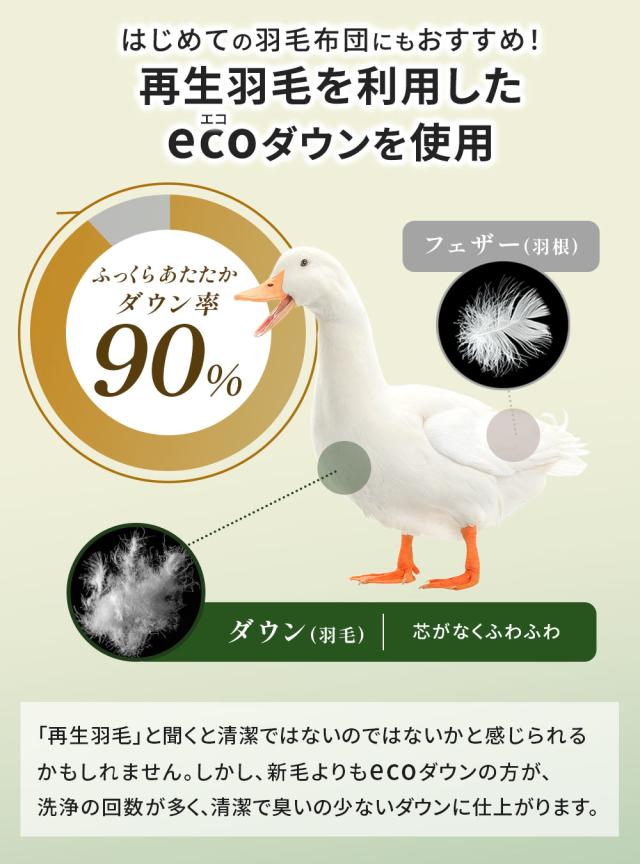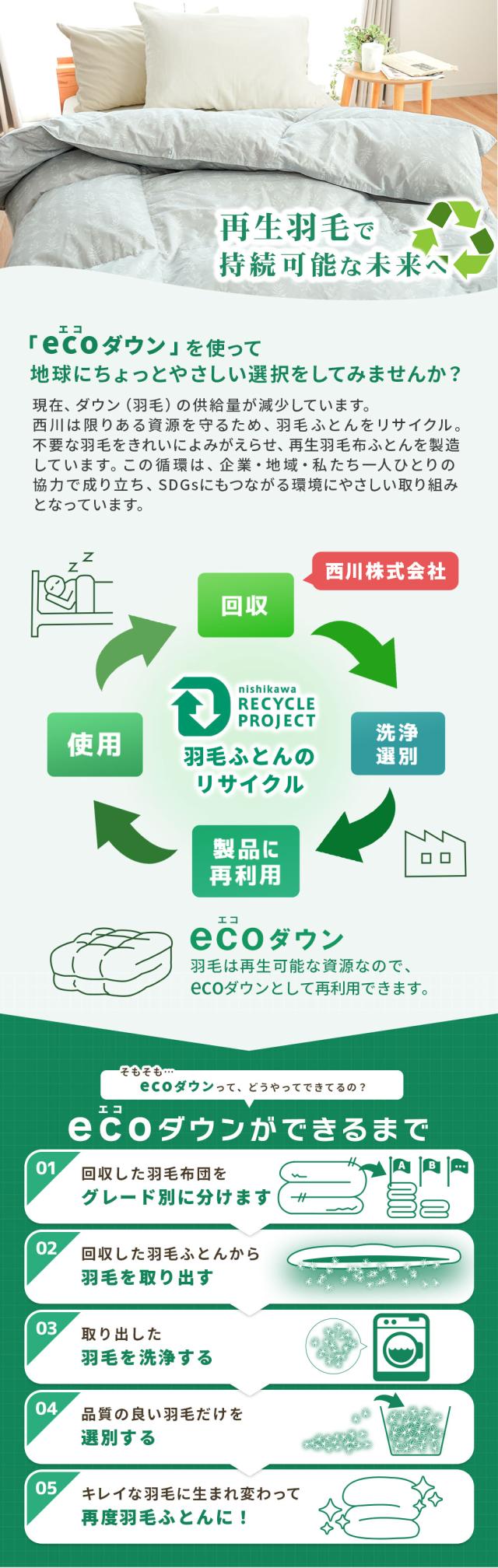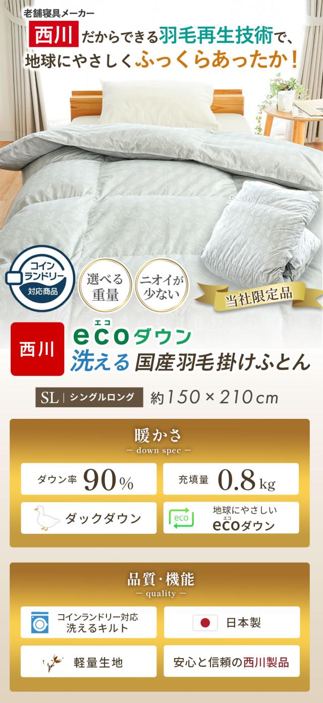 【〜12/15迄10%OFFクーポン対象】西川 コインランドリー対応 洗える 羽毛布団 シングル ロング ecoダウン エコダウン 日本製 ダックダウン90% 再生羽毛 0.8kg 合い掛け 暖かい 羽毛ふとん 掛け布団 冬用 冬 エコ サステナブル あったか 150×210cm 国産 当社限定