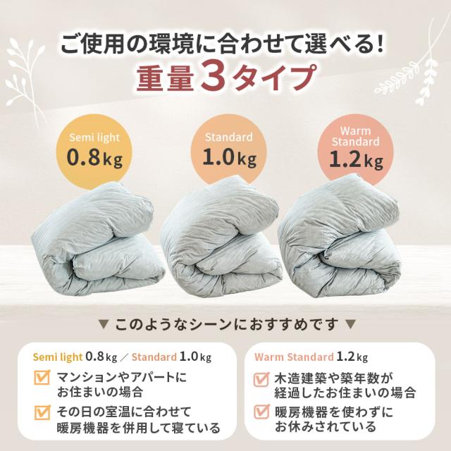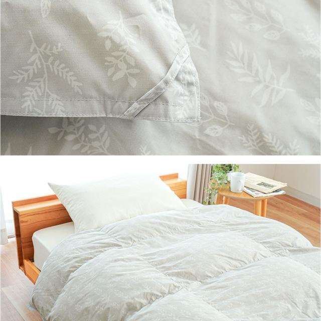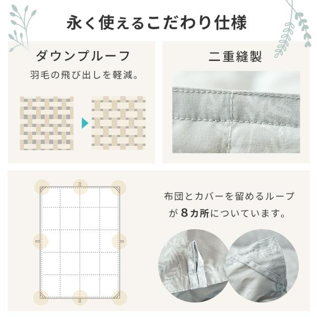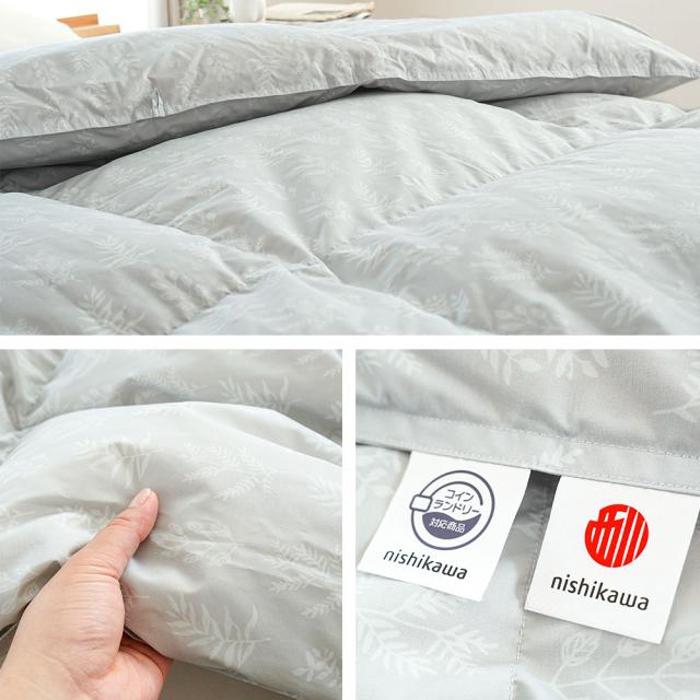 ・「ecoダウン」で地球にちょっとやさしい選択を ダウン(羽毛)の供給量が減少している現在、限りある資源を守るために羽毛ふとんをリサイクル。不要な羽毛をきれいによみがえらせて再生羽毛布ふとんを製造。企業・地域・私たち一人ひとりの協力で、SDGsにもつながる環境にやさしい取り組みです。 ・コインランドリー対応で乾きやすく、快適に使える洗えるキルトコインランドリーで洗濯ができる特殊構造のキルト。乾きやすく、体に当たる縫い目が少ないため熱を逃がさず、羽毛の片寄りもしにくい快適設計です。 ・高気密住宅にお住まいの方におすすめマンションや新築一戸建てなどの高気密住宅では、お部屋の湿度が高く、従来の羽毛布団では暑すぎるという声も。そんな方には、詰め物量を少し減らした羽毛布団がおすすめです。 ・はじめての羽毛布団にもおすすめ!再生羽毛のecoダウンを使用ふっくらあたたかいダウン率90%。芯がなくふわふわのダウン(羽毛)で快適な寝心地。新毛よりも洗浄の回数が多いため、清潔で臭いの少ないダウンに仕上がっています。 ・再生羽毛でも安心!より美しく、国内洗浄業界水準の2倍、洗浄度1000mmの高水準で仕上げた清潔な羽毛を使用。汚れや脂分をしっかり落とし、快適でにおいの少ない羽毛本来のふくらみを実現します。 ・創業450年以上の信頼。安心の高品質、西川製品西川の厳しい基準のもと、羽毛布団から取り出したダウンをリサイクル・洗浄して使用。長年の信頼と実績に支えられた高品質なものづくりで、安心して使える商品です。 ・当社限定デザイン!軽くて快適な綿混生地植物をモチーフにした北欧調のオーガニックなオリジナルデザイン。ポリエステル繊維にコットンを配合して吸湿性をプラス。素朴でかわいい北欧模様が魅力です。 |
