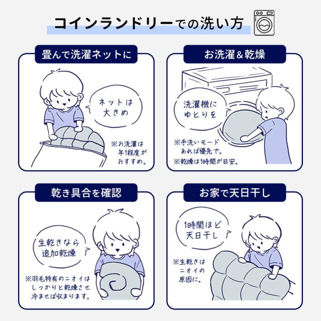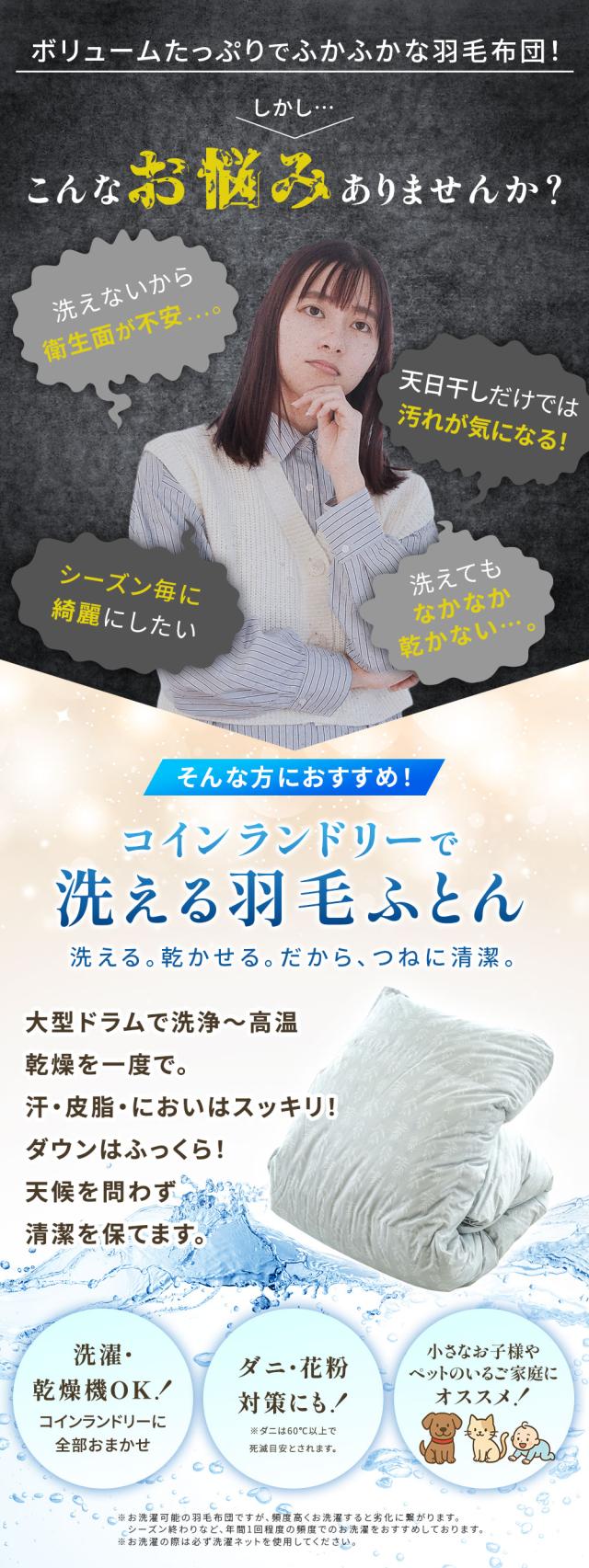 ■お洗濯可能の羽毛布団ですが、頻度高くお洗濯すると劣化に繋がります。シーズン終わりなど、年間1回程度の頻度でのお洗濯をおすすめしております。 |
