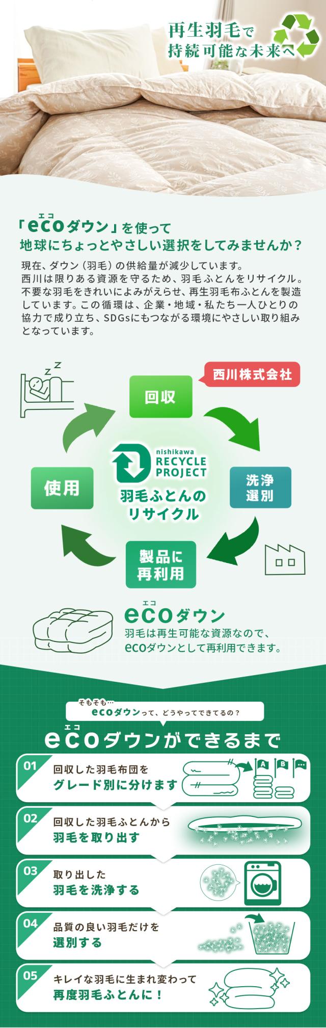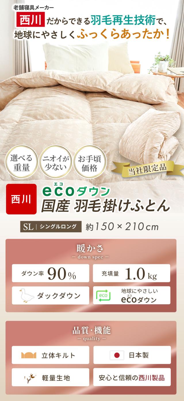 西川 羽毛布団 シングル ダウン90% 1kg 本掛け 日本製 ecoダウン エコダウン 国産 ダックダウン90% 再生羽毛 シングルロング 150×210cm 暖かい 羽毛ふとん 掛け布団 冬用 冬 エコ サステナブル あったか 当社限定