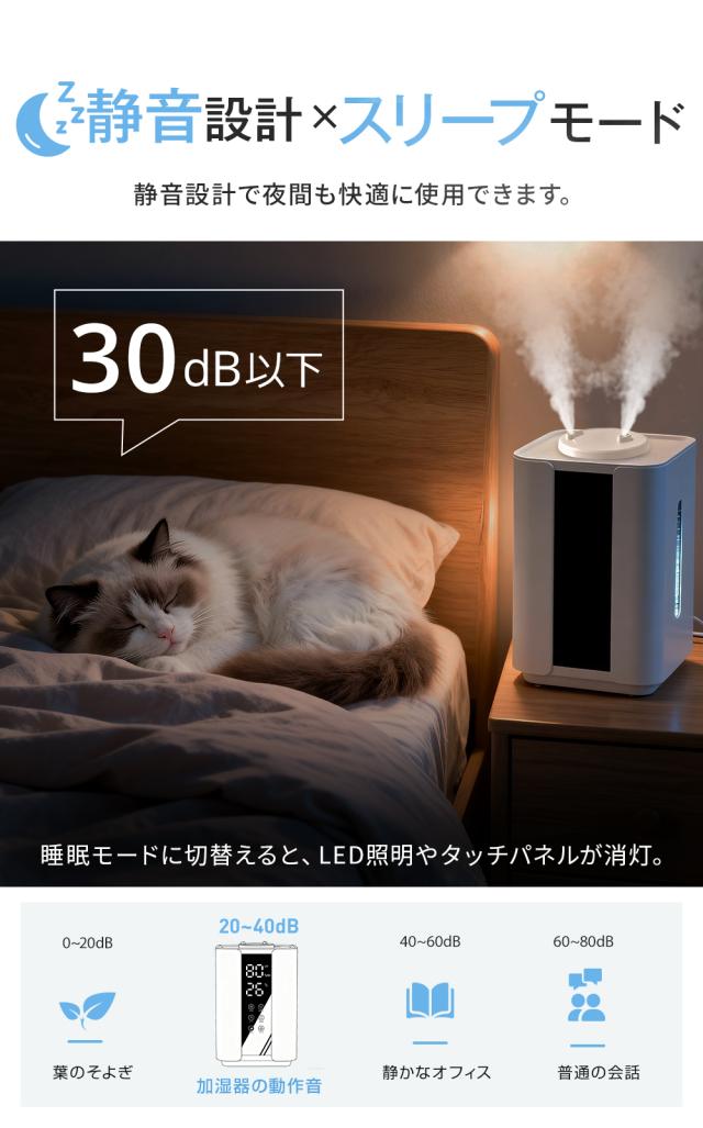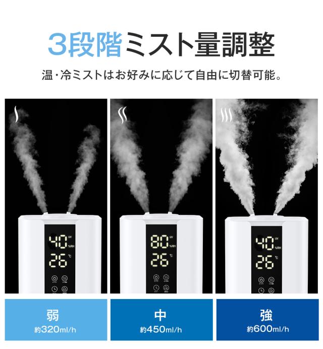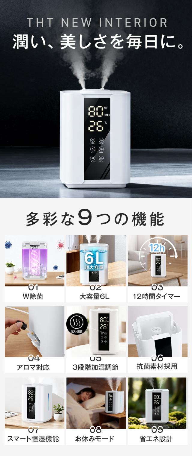 【セール開催中!】加湿器 卓上加湿器 超音波式 大容量 6L ダブルノズル加湿器 UVライト付き 双重除菌 上部給水 3段階調節 タイマー付き 焚き防止 静音 節電 省エネ エコ 軽量