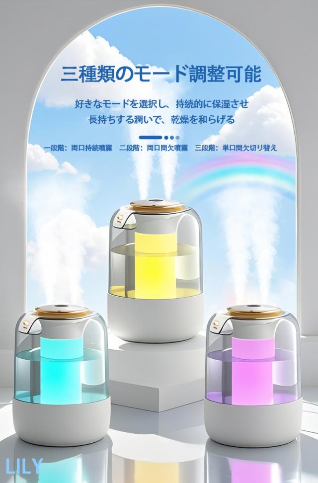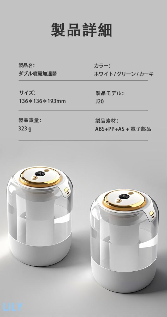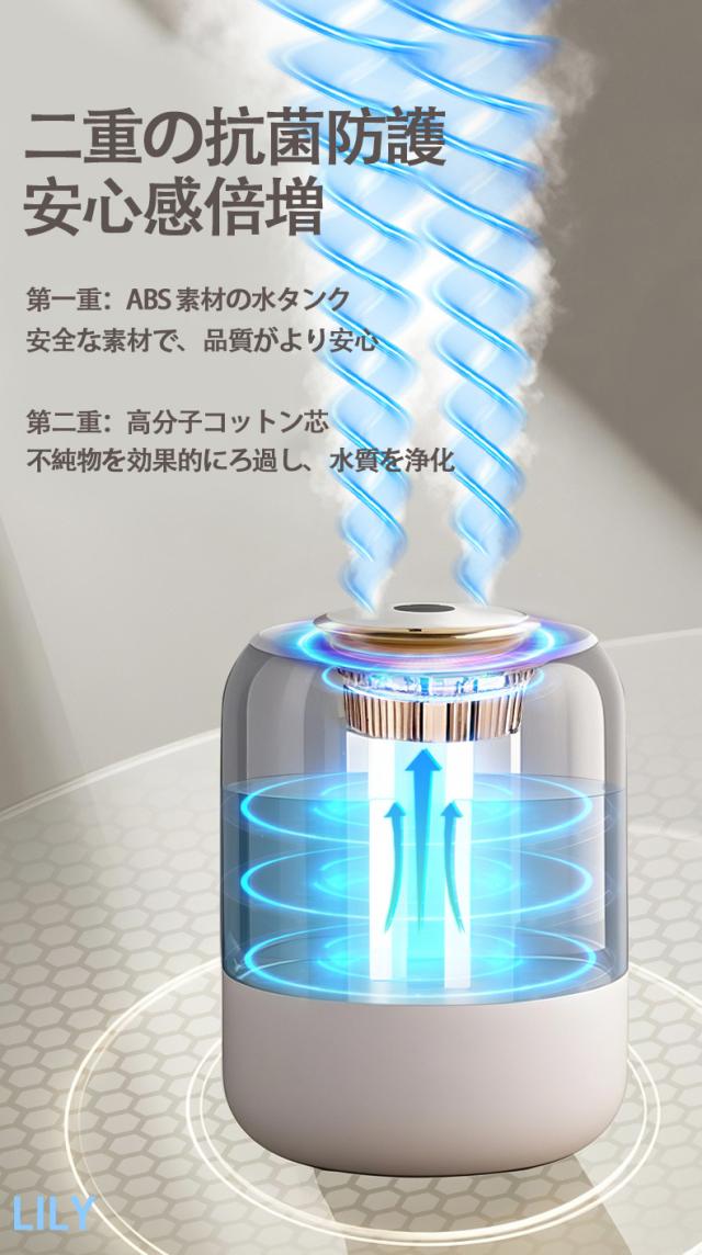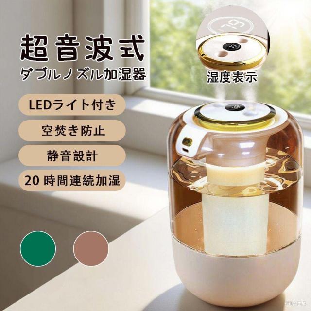 加湿器 卓上 超音波式 2L 大容量 ダブル噴霧口 USB式 空焚き防止機能 湿度表示 静音 加湿機 おしゃれ 省エネ 節電 LEDライト 長時間加湿 乾燥対策 室内 保湿 乾燥 花粉