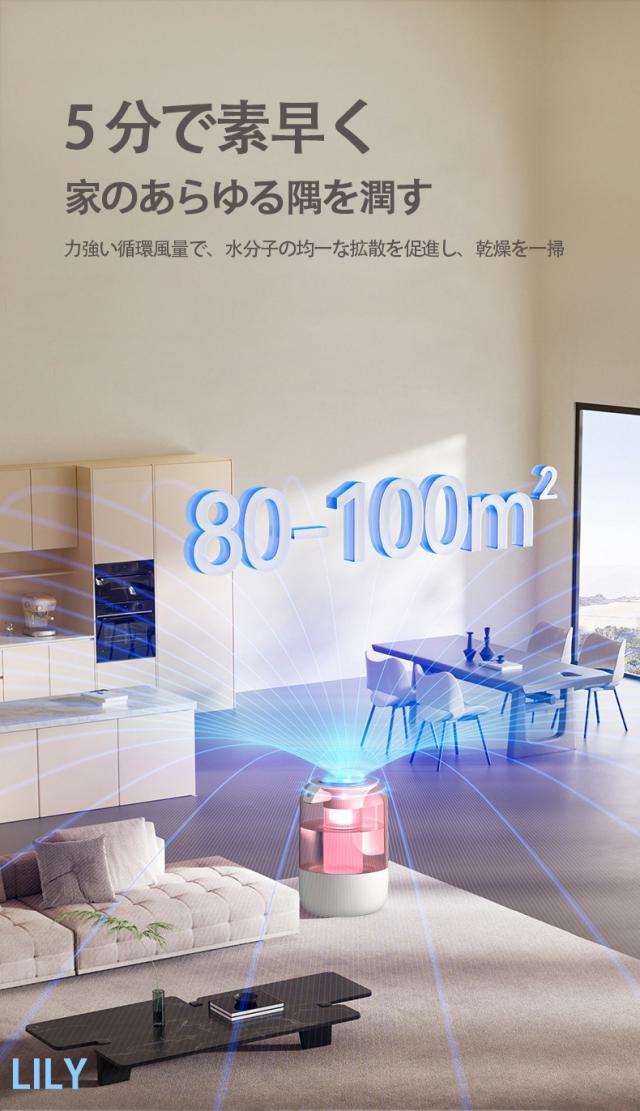 2つのミスト噴霧口が細かいミストで素早くお部屋をうるおす、水が積もることがない超音波方式を採用しています。
