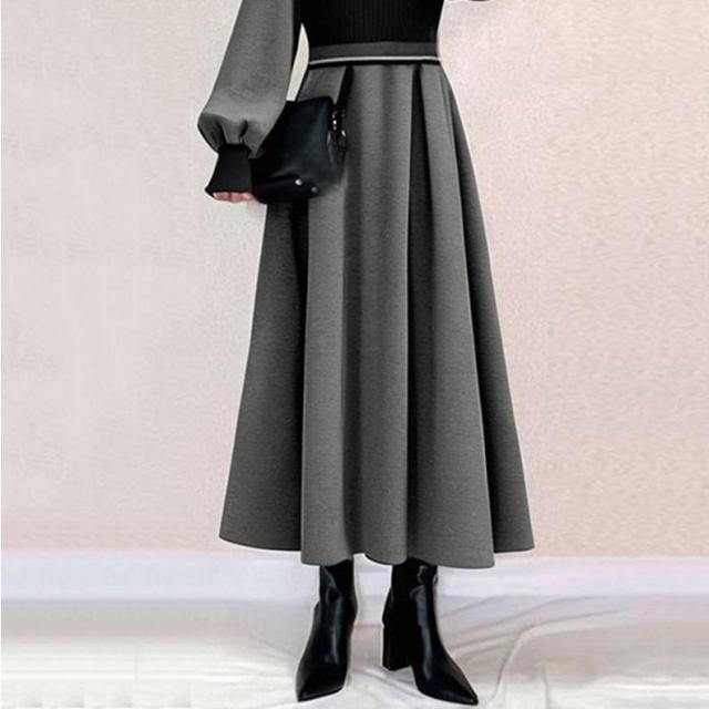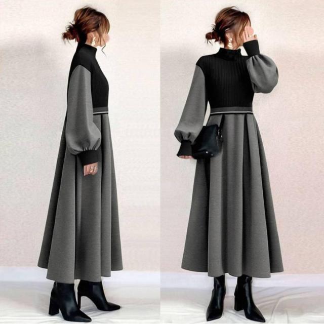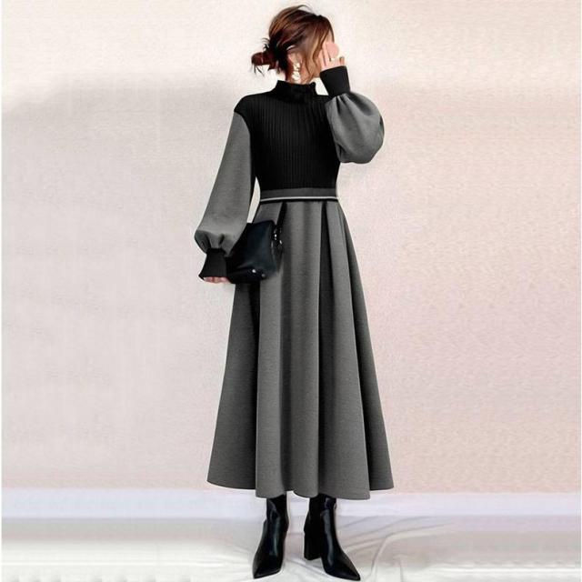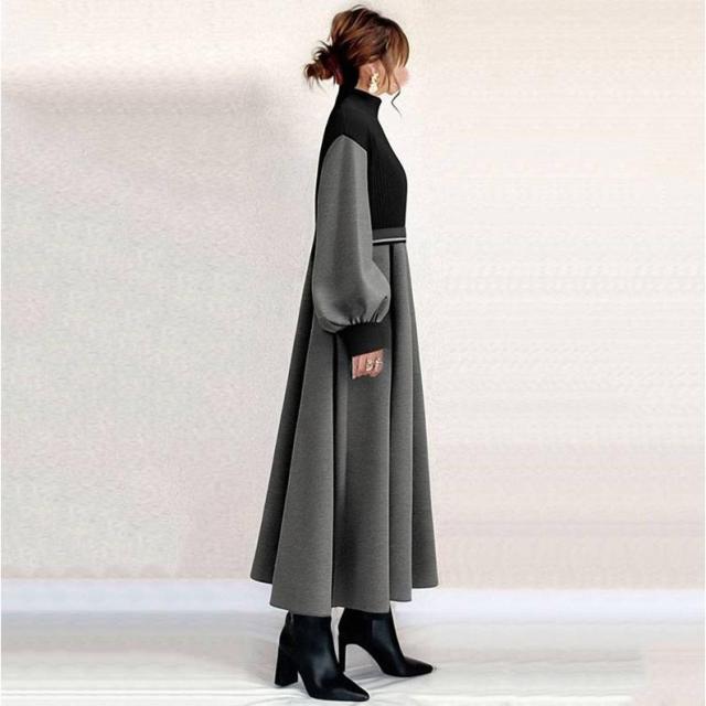 ワンピース ドッキング ニットトップス パフスリーブ 配色 可愛い マキシワンピース 切り替え 通勤 通学 春秋 レディース