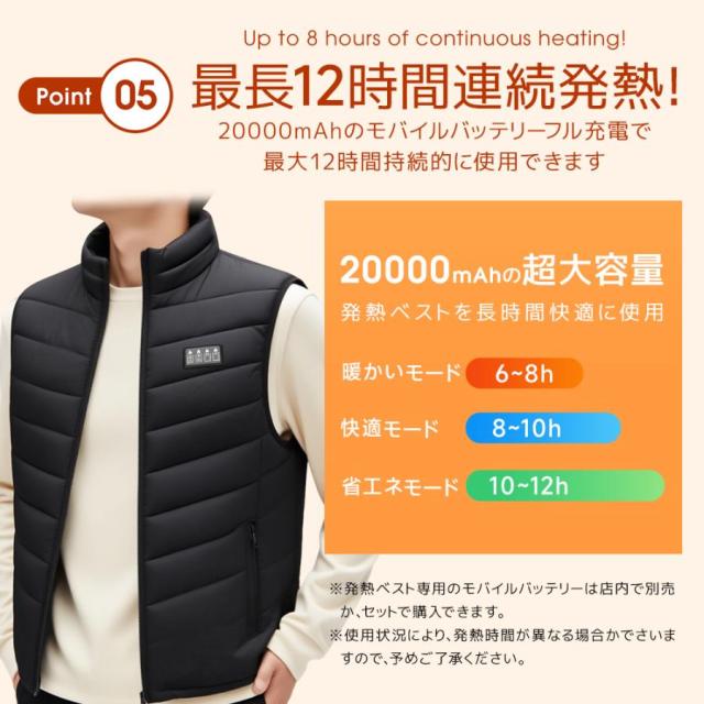 高効率ヒーターで電源ONから約5秒でじんわり暖かく、20000mAhバッテリー使用で最長約12時間稼働。