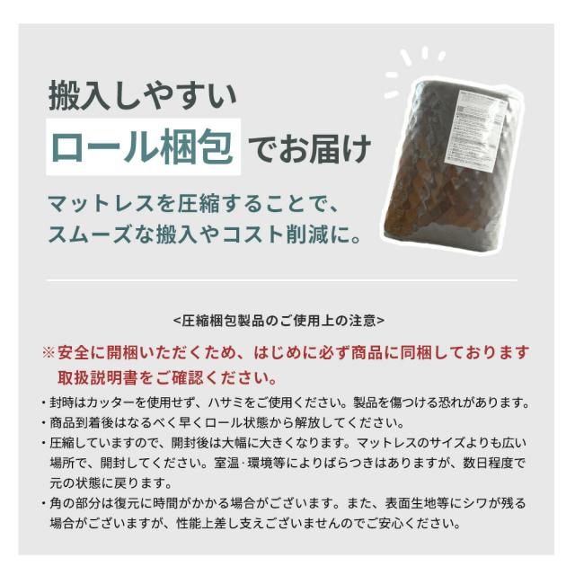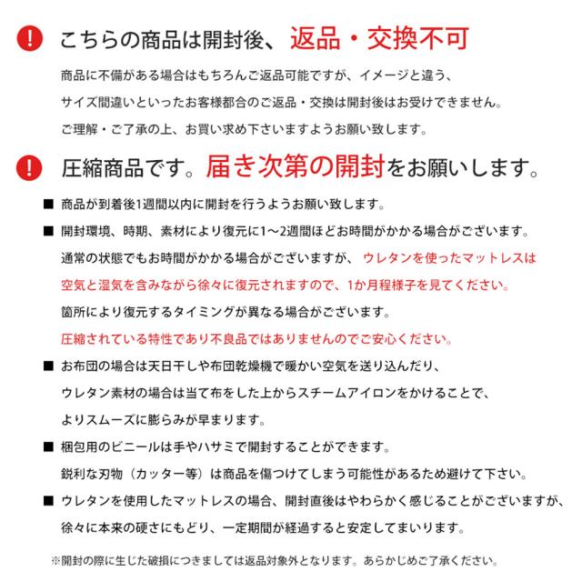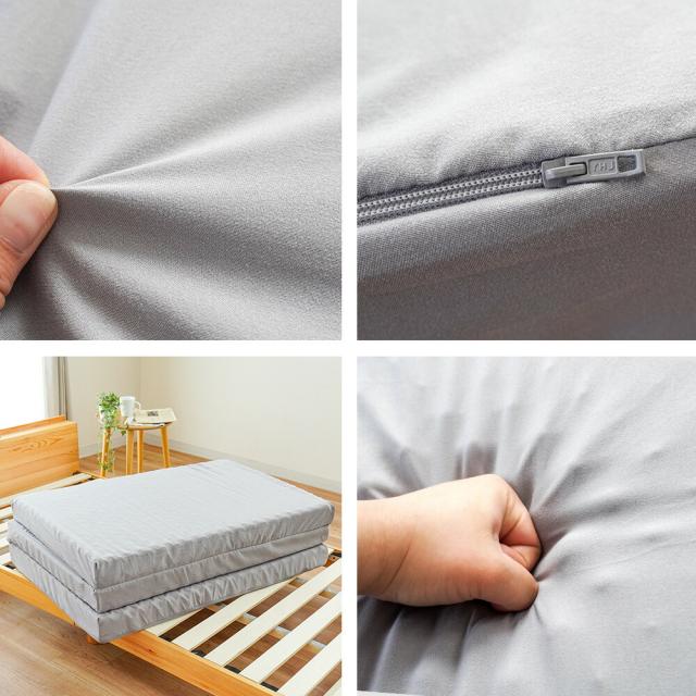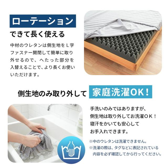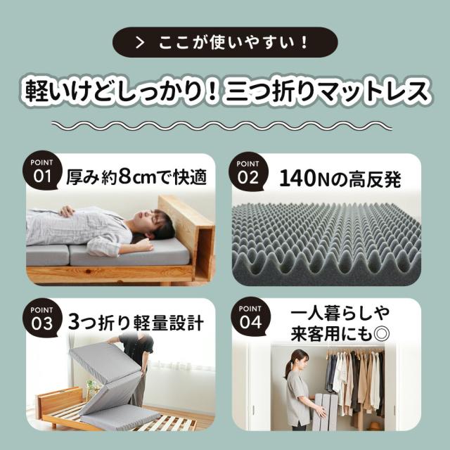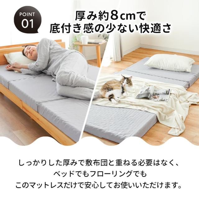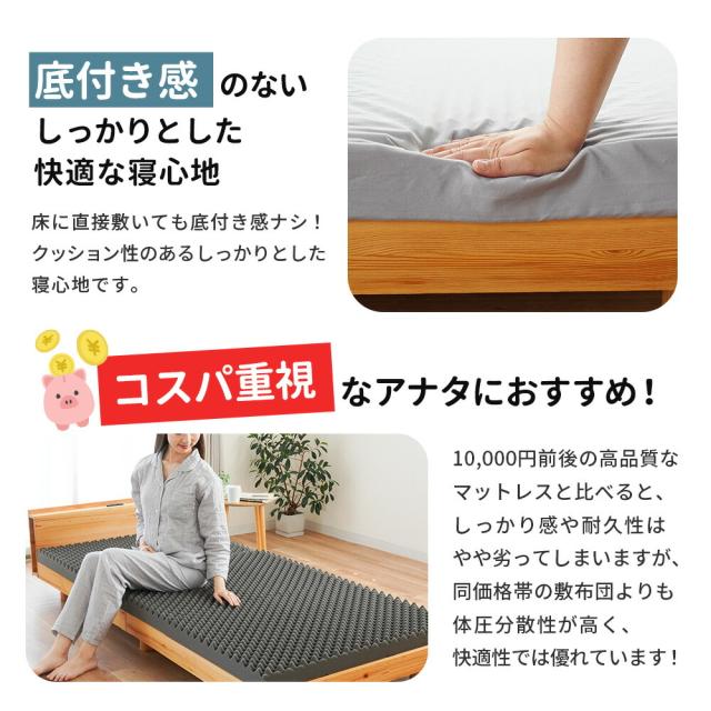 ・厚み約8cmで底付き感の少ない快適さ しっかりした厚みで敷布団と重ねる必要はなく、ベッドでもフローリングでもこのマットレスだけで安心してお使いいただけます。 ・底付き感のないしっかりとした快適な寝心地床に直接敷いても底付き感ナシ!クッション性のあるしっかりとした寝心地です。 ・コスパ重視なアナタにおすすめ!10,000円前後の高品質なマットレスと比べると、しっかり感や耐久性はやや劣ってしまいますが、同価格帯の敷布団よりも体圧分散性が高く、快適性では優れています! ・140Nの高反発プロファイルウレタンで快適な寝姿勢をサポート凸凹構造が身体を点で支えて体圧を分散。寝姿勢にこだわった設計で、身体への負担を軽減しながら寝返りをサポートします。耐久性に優れた軽量ウレタンに無数の突起を施したプロファイル加工で、寝汗や湿気も発散し快適な睡眠環境を実現します。 ・3つ折り式で収納・持ち運びも簡単軽量設計で女性でもラクラク。折りたためば押入れやクローゼットにすっきり収納できます。 ・ローテーションできて長く使える中材のウレタンは側生地をL字ファスナーで簡単に取り外せるので、へたった部分を入れ替えることで、より長くお使いいただけます。 ・側生地のみ取り外して家庭洗濯OK!手洗いのみにはなりますが、側生地は取り外して丸洗いできるので、寝汗をかいても安心してお手入れできます。 コンパクトに収納できるので、ワンルームでの使用やゲスト用にも最適です。 |