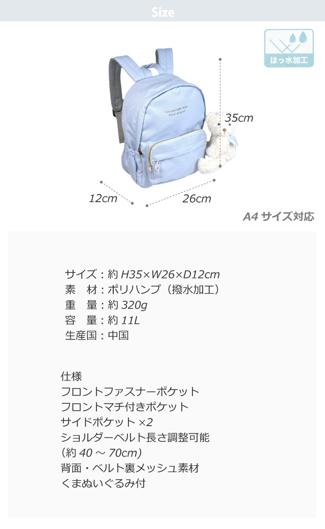 ![]() ![]() ![]() ![]() ![]() ![]() ![]() ![]() ・anilet アニレット クマつき ふわふわテディベア付きのかわいいリュックサック。 小学生の女の子に人気です。 A4サイズ対応で収納力も抜群。 修学旅行・旅行・遠足・通園・通学・お出かけにおすすめ。