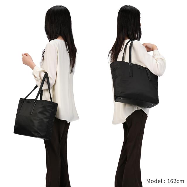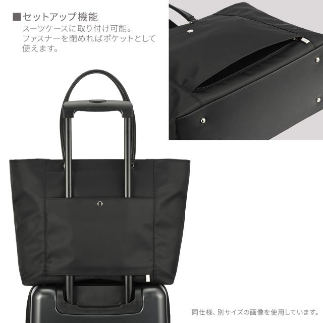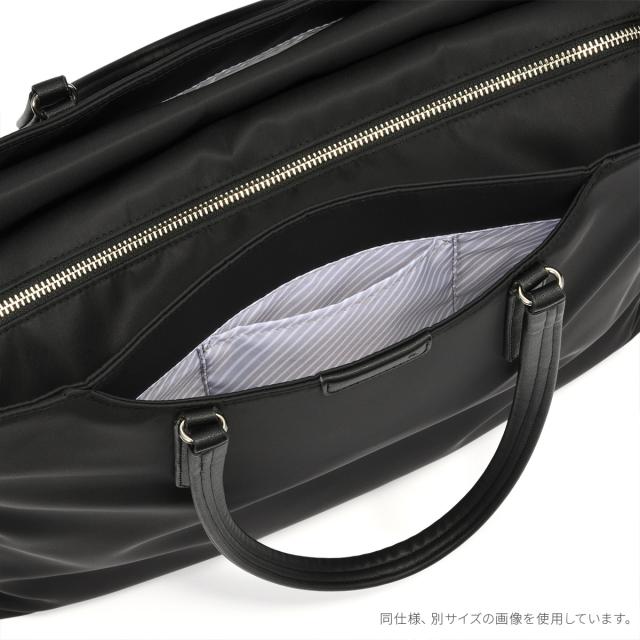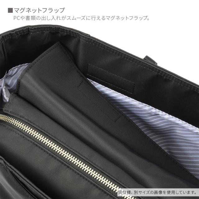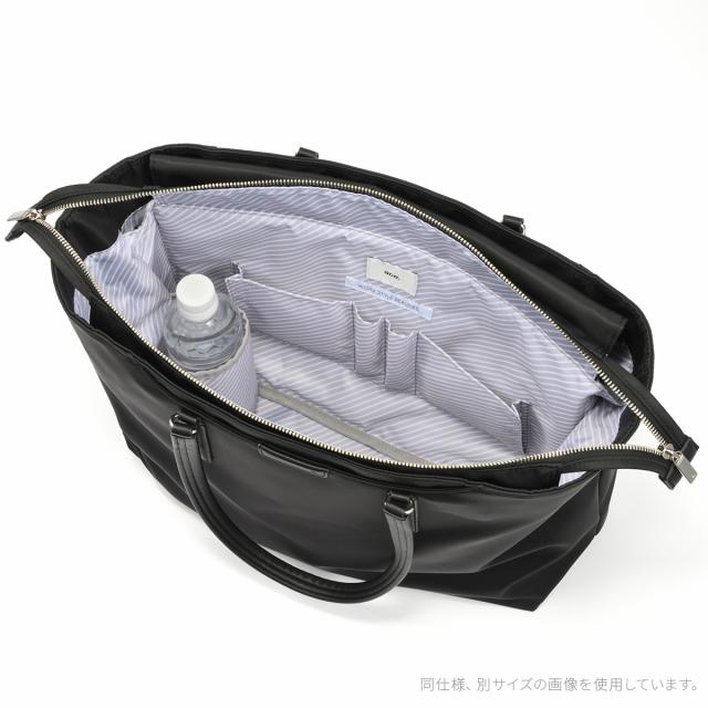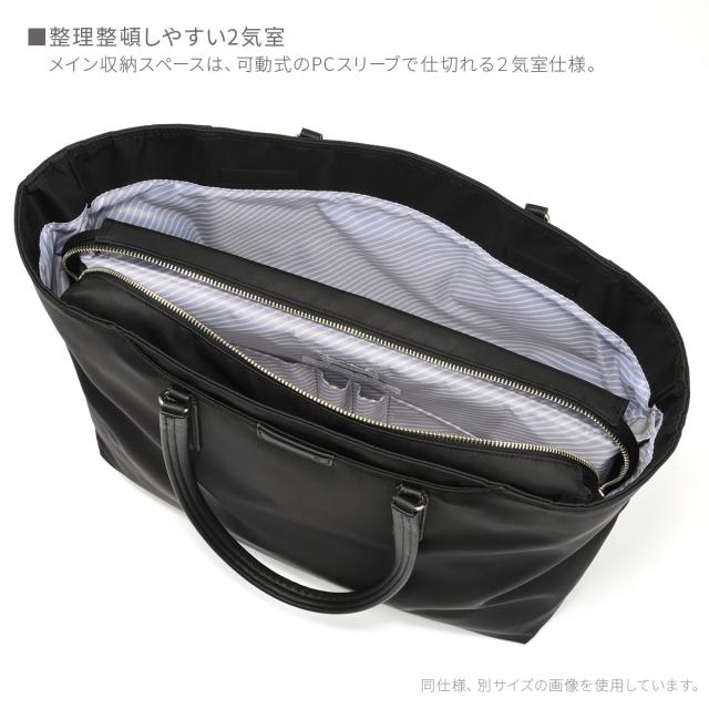 | 使い勝手にこだわった通勤トートバッグの決定版「フロモ」 シンプルなデザインと充実の機能で、ビジネスシーンを快適に支えるトートバッグです。 13.3インチノートPC、A4ファイルが入るサイズ感。 モバイル周辺機器やファイル類、ポーチ、お弁当箱など女性の通勤に必要なアイテムをしっかり収納可能です。 メイン収納スペースは可動式のPCスリーブで仕切れる2気室仕様。 さらに、PC収納部にはPCや書類の出し入れがスムーズに行えるマグネットフラップを採用しました。 ハンドルはもちもち素材&平手のデザインで、肩掛けした際に食い込みにくい工夫を施しました。 ●スインギングPCスリーブ 前後に可動するPCスリーブには13.3インチノートPCが収納可能。 クッション入りで、安心してノートパソコンを持ち運ぶことができます。 PC周辺機器等の収納に適したクッション入りポケット付き。 ※参考収納寸法 13.3インチノートPC:W310×H220×D25[mm] ●内装ポケット 大きめのファスナーポケットや、細かいアイテムの収納に適したオーガナイザーポケットを配置。 ●ボトルホルダー 水筒や折り畳み傘を立てて収納できる便利なポケット。 ●フロントポケット 肩にかけたままでも取り出しやすいオープンポケットを上部に配置。 ●背面ポケット 背面にもポケットを配置。 下部のファスナーを開ければ、セットアップベルトとしても使用可能です。 スーツケースなどのプルドライブハンドルに固定できます。 ●ハンドル 柔らかな質感のハンドル。 ハンドル部分が倒れるように設計されているため、座ったときや床に置いたときも邪魔になりません。 ●底部 底部には汚れを拭き取りやすい合皮素材を採用。自立しやすくなる底鋲付きです。 ●内装生地 薄暗い場所でも荷物を見つけやすいよう、明るいグレーのストライプ生地をメイン気室、フロントポケットに採用。 PC収納スペースには柔らかな素材感のグレーの生地を使用しています。 |