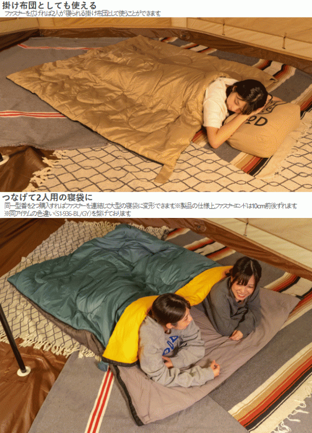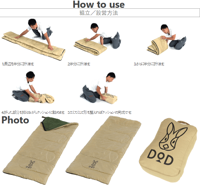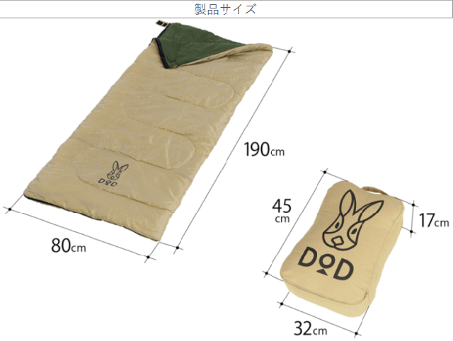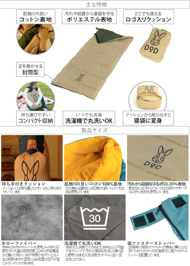 寝るだけじゃない。どこでもいっしょ。クッションから中身を取り出すと寝袋に変身します。ピクニックやキャンプに持ち出しやすいサイズで抱きまくらやインテリアアイテムとして使えます。クッションのサイズに合わせて大きくウサギロゴをプリントしました。足元にゆとりがあり広々寝られる封筒型の寝袋です。ファスナーを広げれば2人が寝られる掛け布団として使うことができます。同一型番を2つ購入すればファスナーを連結して大型の寝袋に変形できます。■カラー:タン/カーキ■サイズ約W190×D80cm■収納サイズ約W32×D17×H45cm■総重量約1.3kg■材質[表地]ポリエステル[裏地]コットン[中綿]ポリエステル[キャリーバッグ(クッションカバー)]コットン■推奨使用温度15℃〜■セット内容:製品本体、キャリーバッグ(クッションカバー)※同一型番を2つ購入すればファスナーを連結して大型の寝袋に変形できます。ファスナーエンドは10cm前後ずれます。