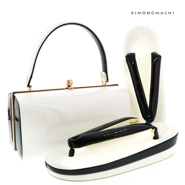 【色柄】バッグの裏表、持ち手の表は艶のあるオフホワイト。バッグ側面、持ち手の裏は黒。口金はゴールド。白と金の組み合わせが高級感のある上品な印象。草履の鼻緒は黒、台はオフホワイトの天に二枚芯の巻は黒とオフホワイト。