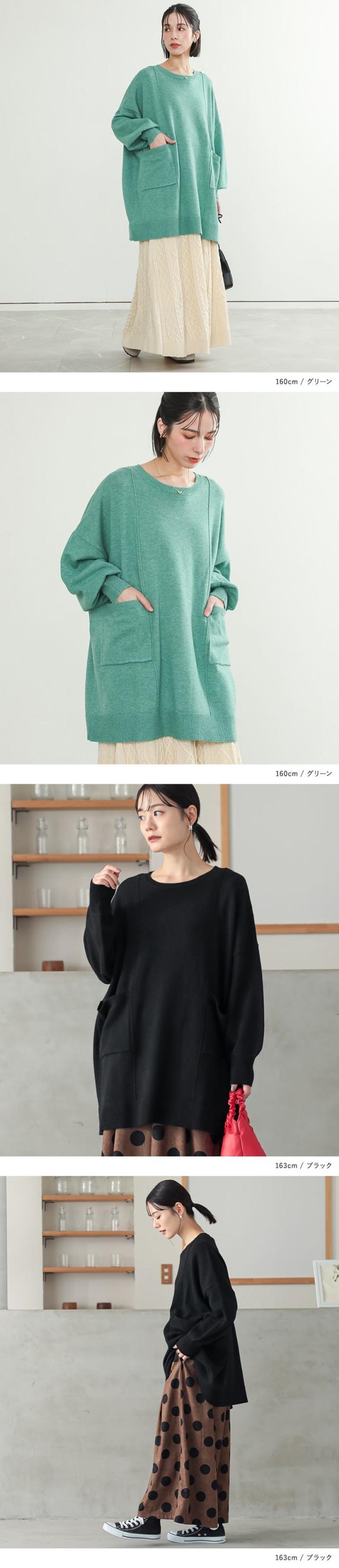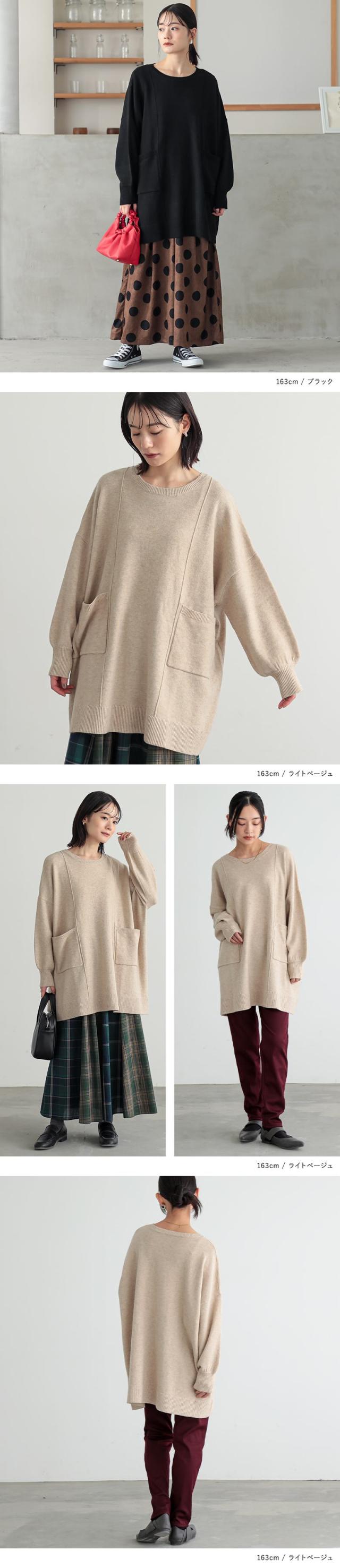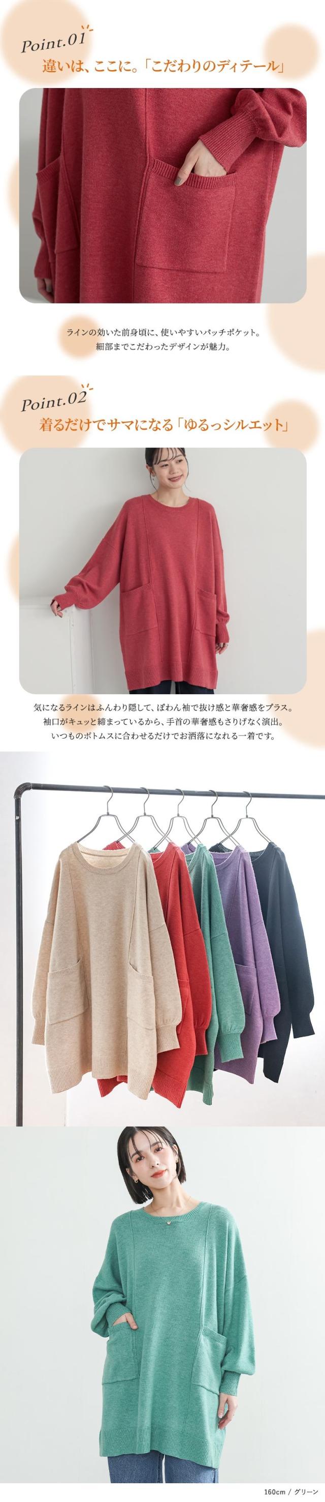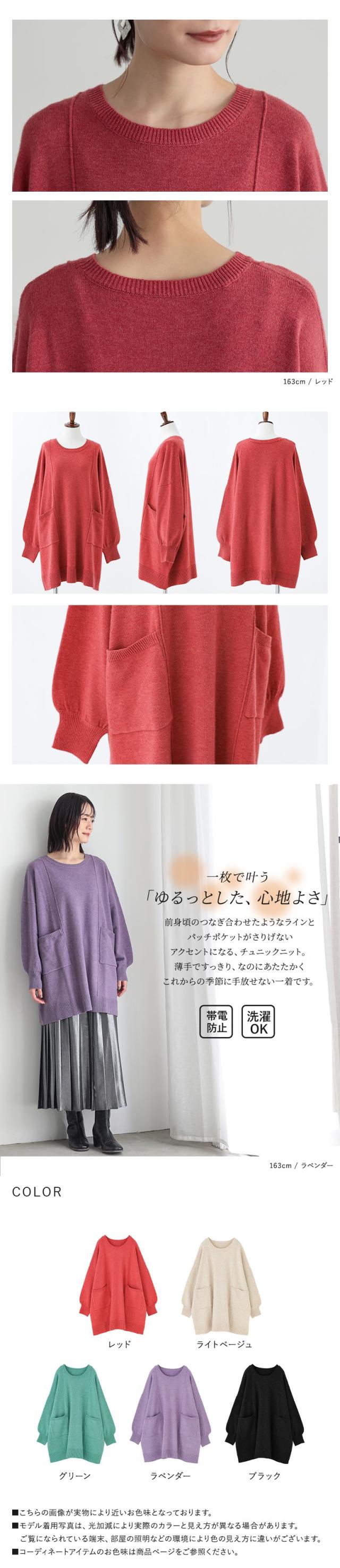 【送料無料】<秋新作>『ポケットデザインチュニックニット』【メール便不可】【20】[ニット 長袖 レディース トップス セーター チュニックニット ぽわん袖 ポケット 薄手 帯電防止 洗濯機可 ゆったり 落ち感 秋 冬 OW12]