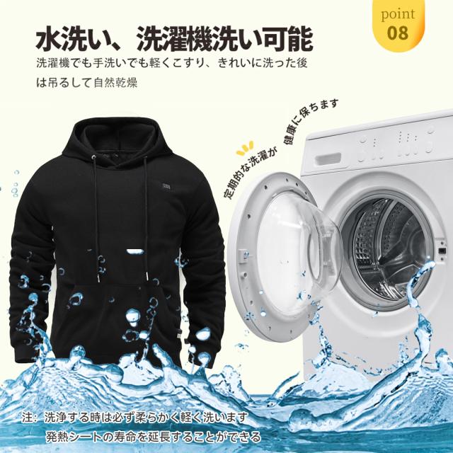 電熱パーカーのバッテリーを取り出して、余熱がない状況で手で洗えます。自然乾かした後、使用することができます。清潔簡単でいつでも綺麗に保ちます。