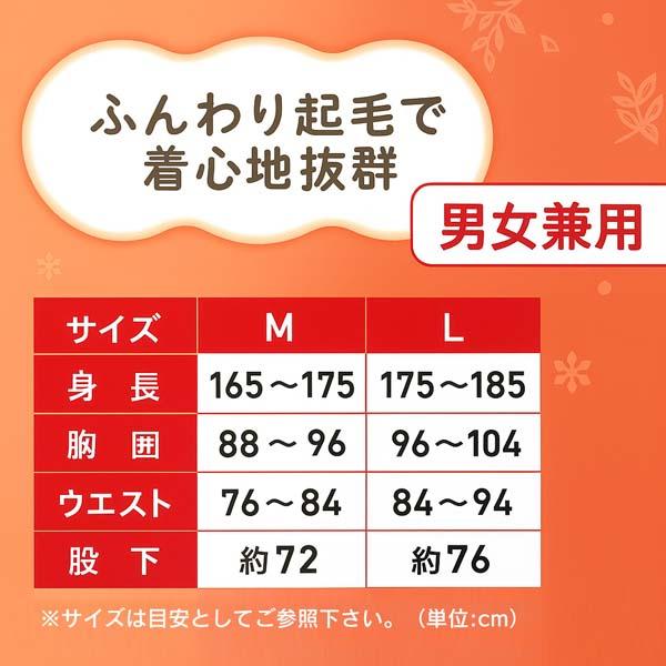 Mサイズ ・身長:165cm〜175cm ・胸囲:88〜96cm ・胴囲:76〜84cm ・股下:約72cm Lサイズ ・身長:175cm〜185cm ・胸囲:96〜104cm ・胴囲:84〜94cm ・股下:約76cm |