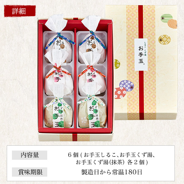 【内容量】6個 (お手玉しるこ、お手玉くず湯、お手玉くず湯(抹茶) 各2個)
