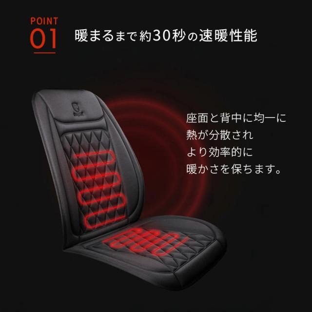 【急速加熱】シートヒーターは30秒で45〜65°Cまで素早く暖まり ドライバーや乗客に素早く暖かさを提供し 冬の寒さによる不快感を効果的に和らげる。