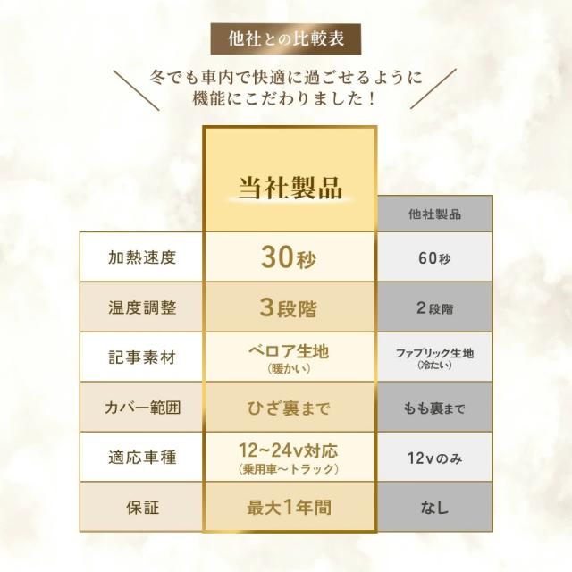 寒い季節のドライブを快適にする「速暖シーターくん」は、わずか30秒で暖かさを実感できる即暖性能が魅力です。3段階の温度調節機能により、お好みの暖かさを選べます。高級感のあるベロア生地が使用され、膝裏までしっかりカバーする設計で、冷えを防ぎます。12vから24vの幅広い車種に対応し、エコ梱包と中間マージンのない物流でお求めやすい価格を実現しました。