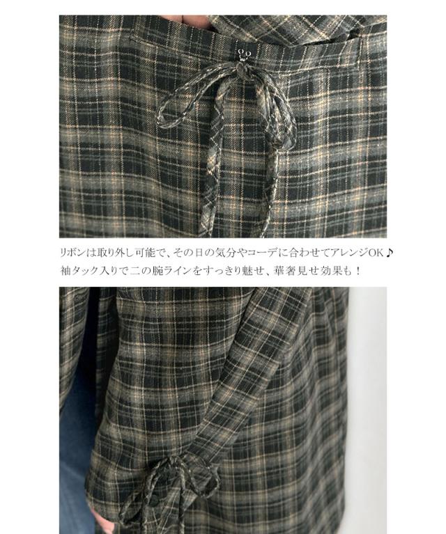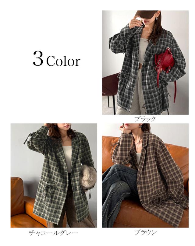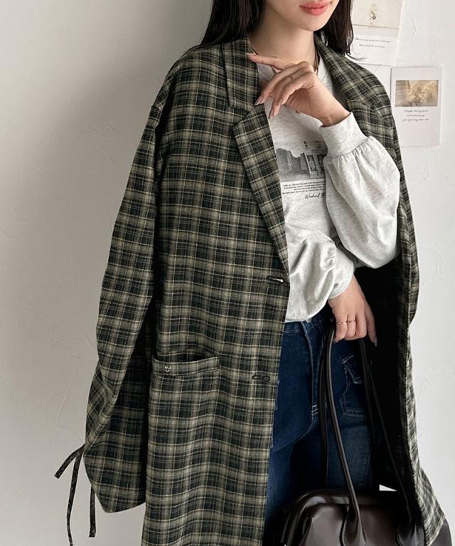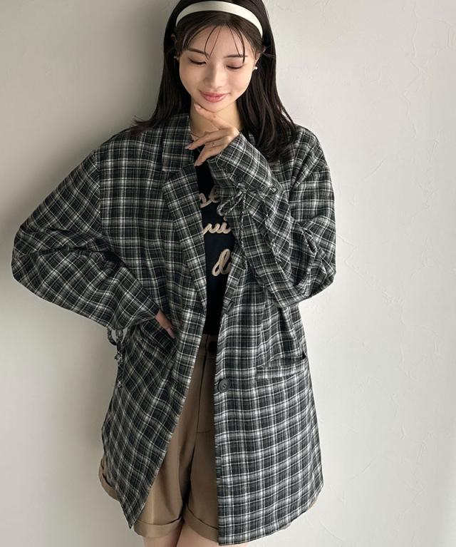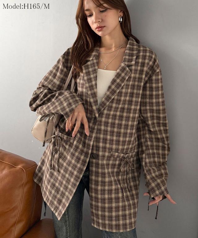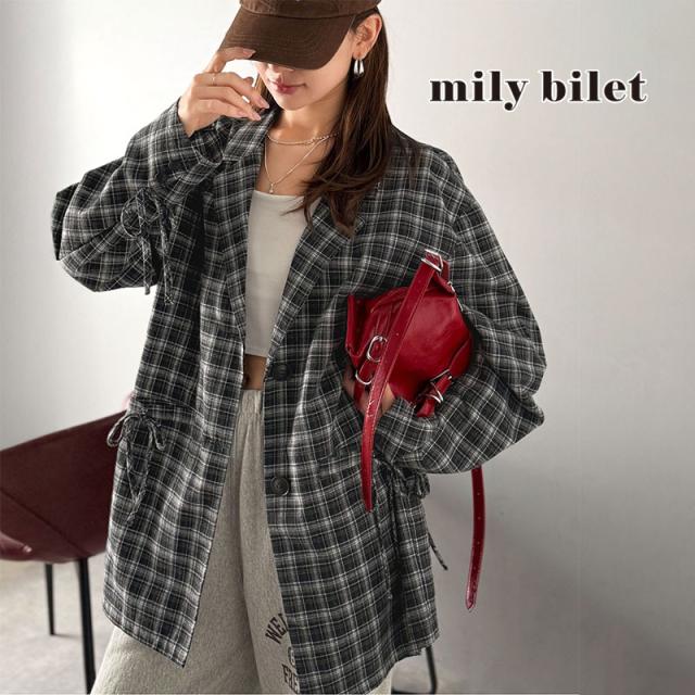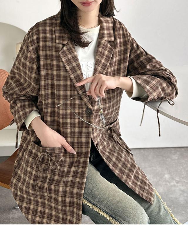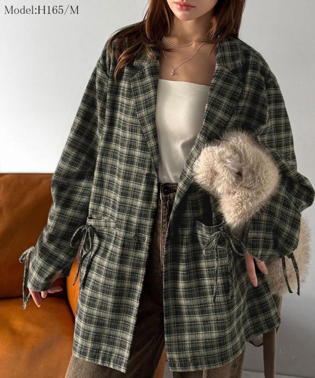 クラシカルエルフ冬新作 mily bilet テーラードジャケット レディース アウター ジャケット お洒落 リボン付き 微起毛 チェック柄 カジュアル きれいめ 自由自在 羽織る 袖タック入り 長め丈 ゆとり 華奢見せ 軽やか 大きいサイズ 2025aw mi1019108