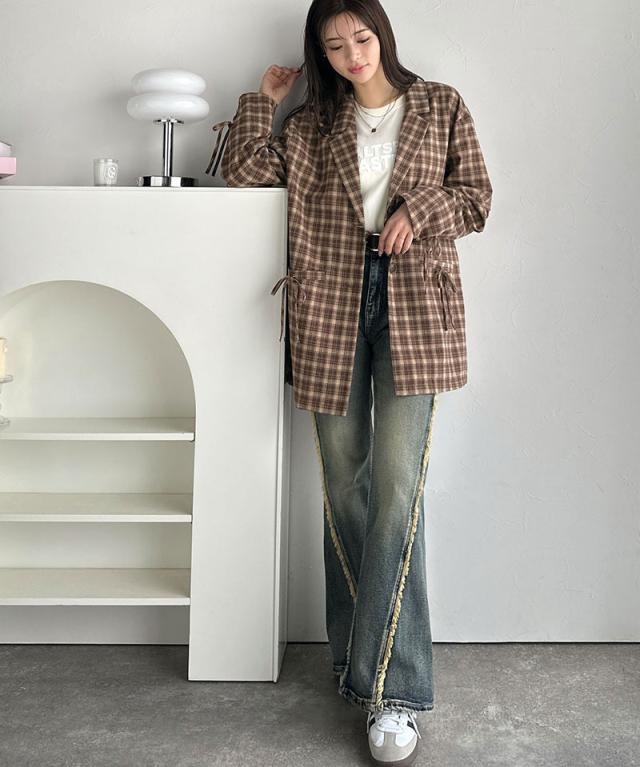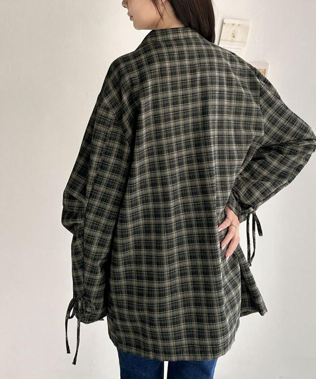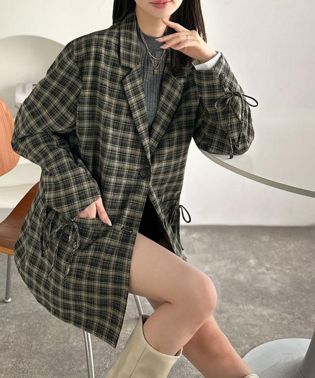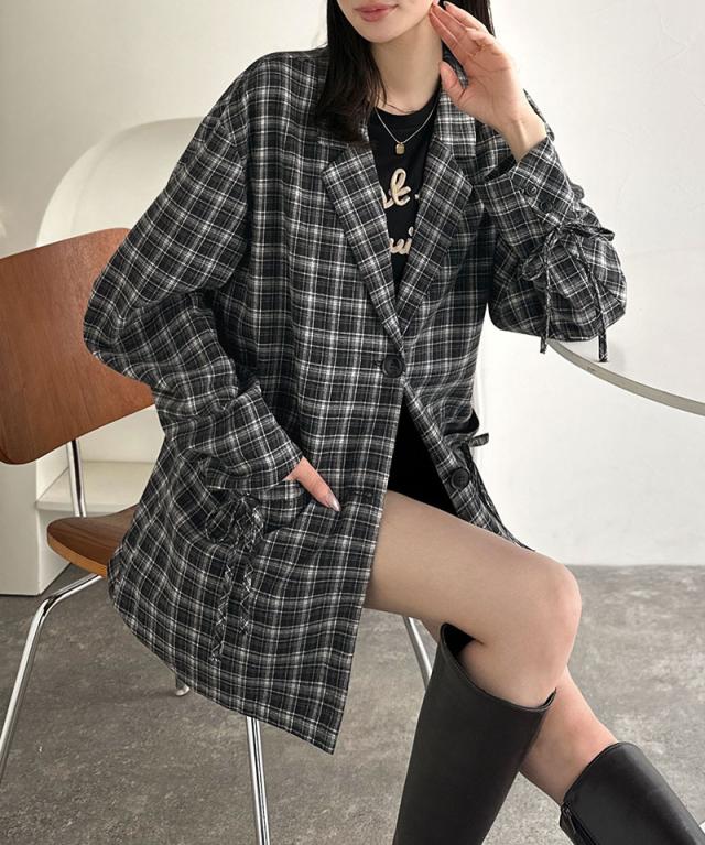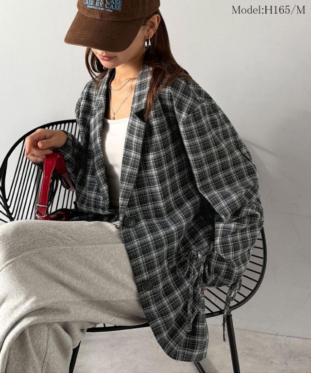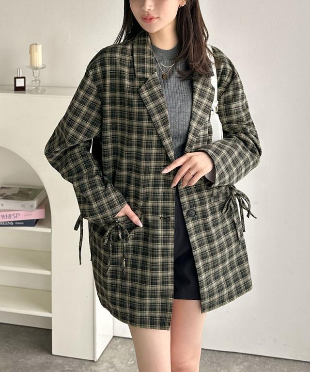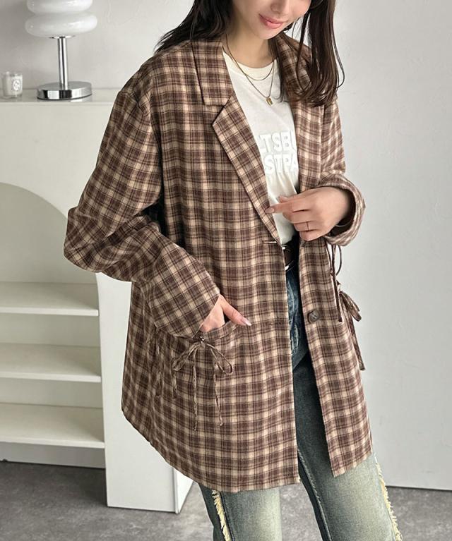 クラシカルエルフ冬新作 mily bilet テーラードジャケット レディース アウター ジャケット お洒落 リボン付き 微起毛 チェック柄 カジュアル きれいめ 自由自在 羽織る 袖タック入り 長め丈 ゆとり 華奢見せ 軽やか 大きいサイズ 2025aw mi1019108