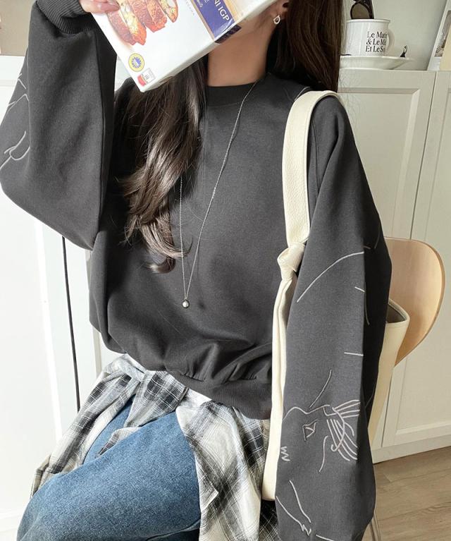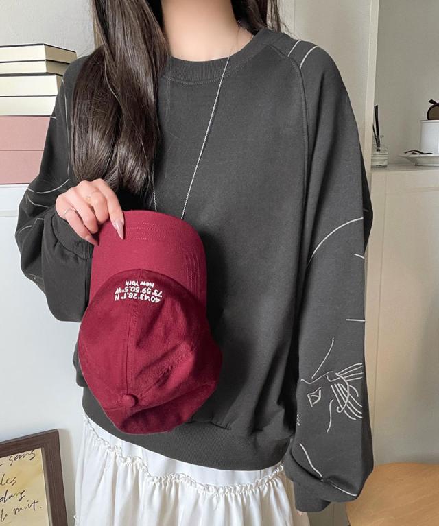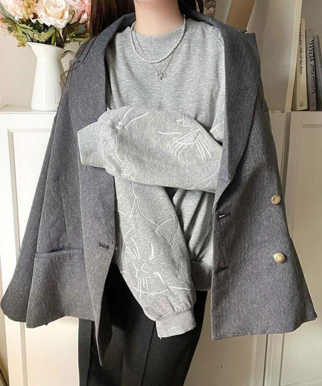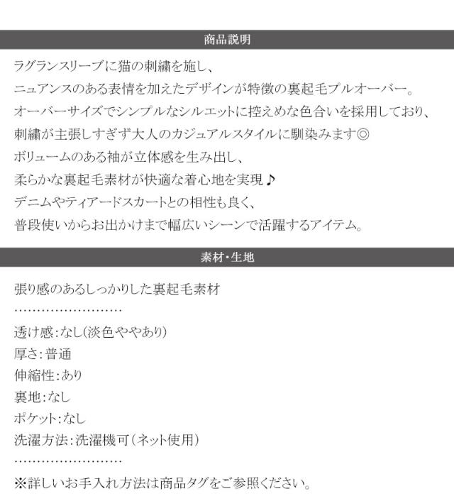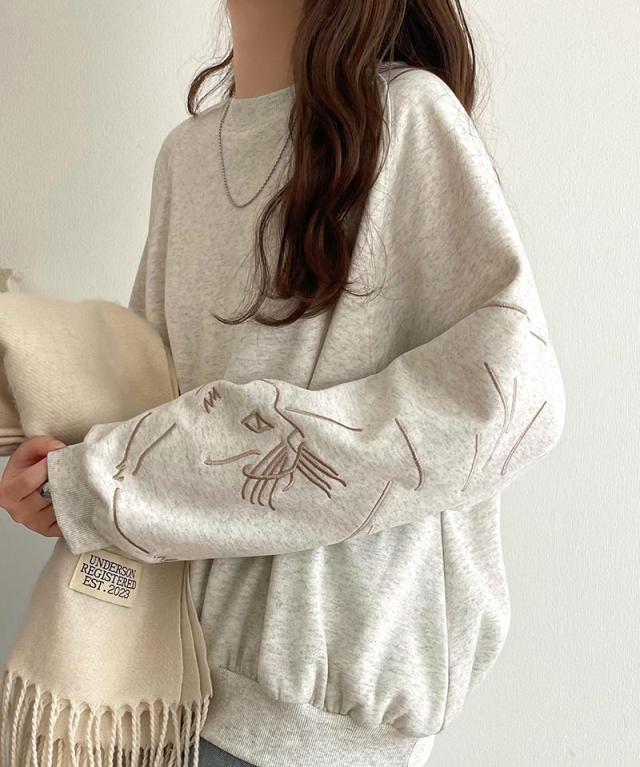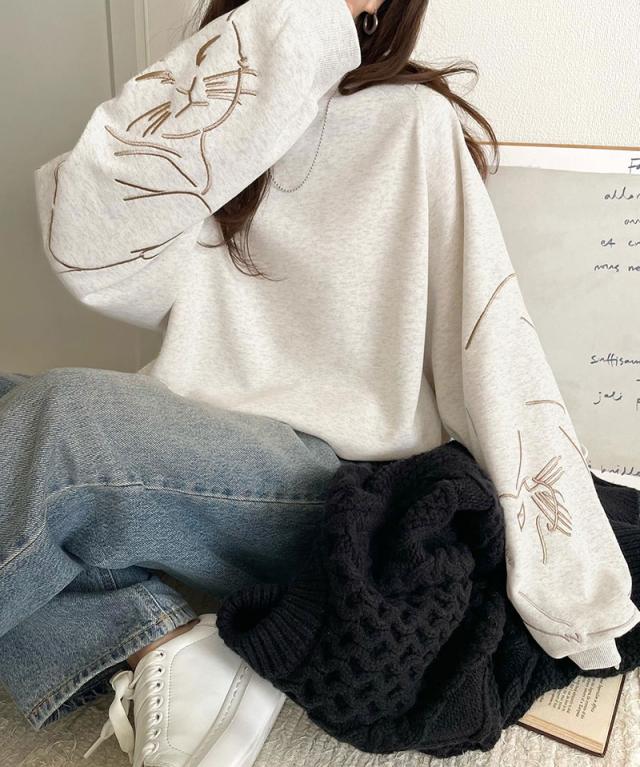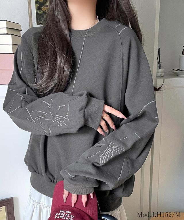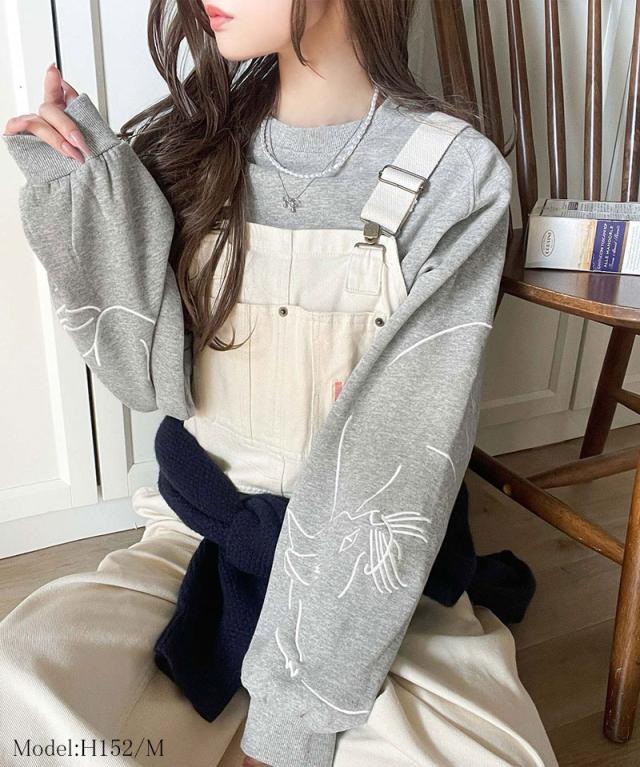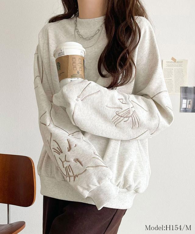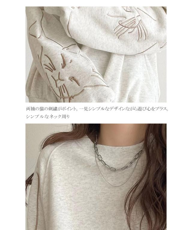 ラグランスリーブに猫の刺繍を施し、ニュアンスのある表情を加えたデザインが特徴の裏起毛プルオーバー。