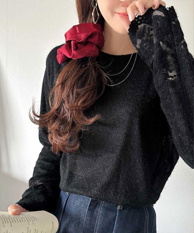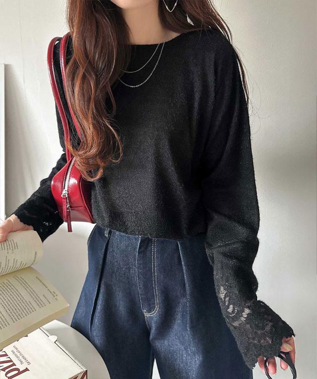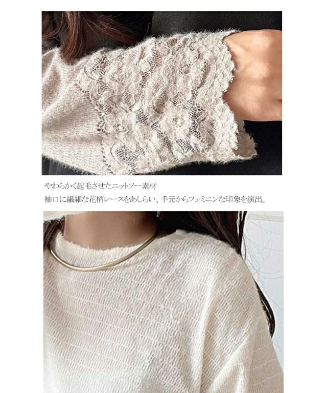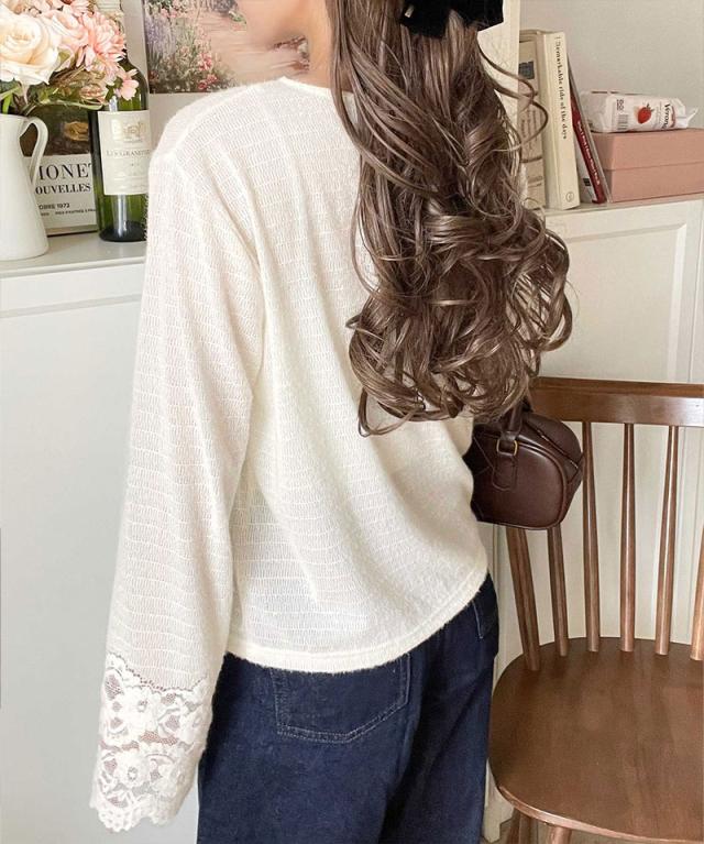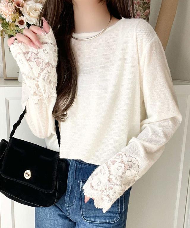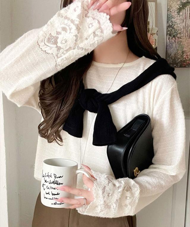 袖口に繊細な花柄レースをスカラップ仕立てであしらい、手元を華やかに彩るニットソー。