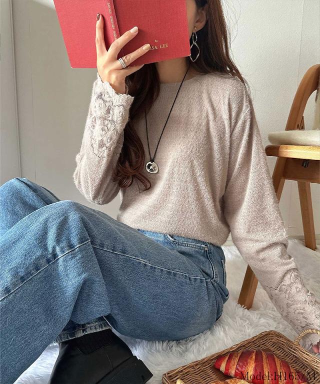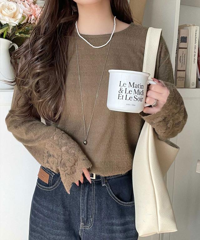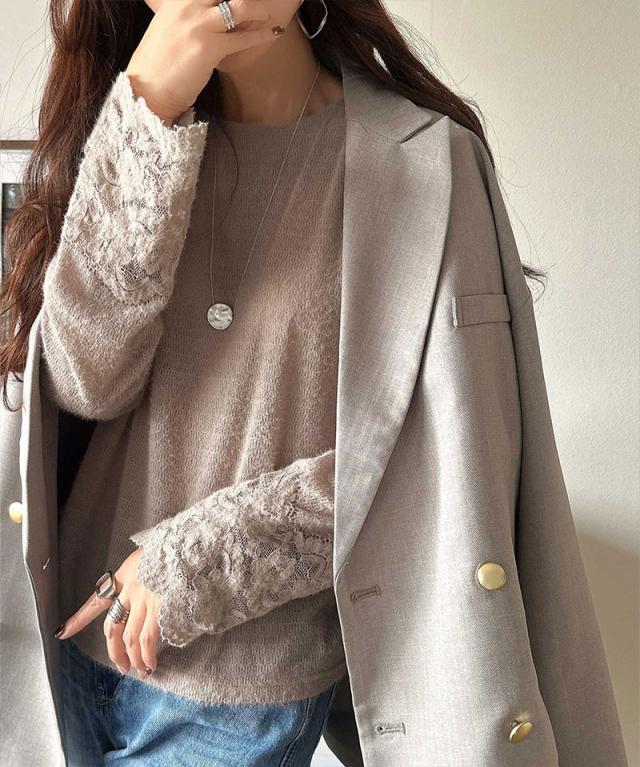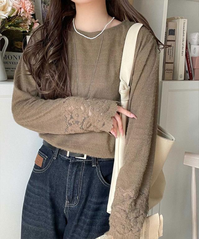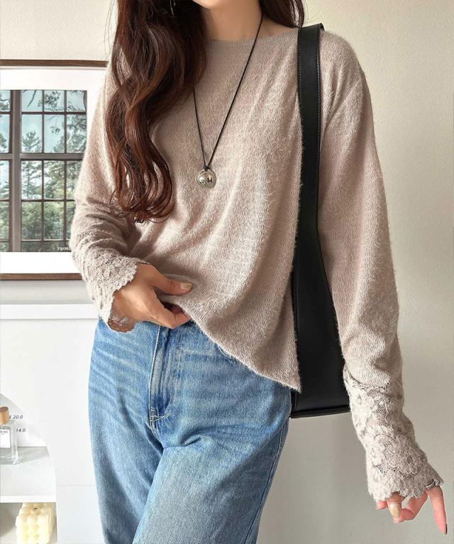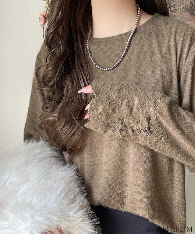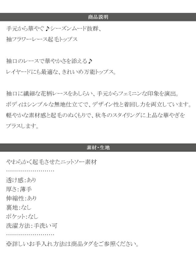 袖口に繊細な花柄レースをスカラップ仕立てであしらい、手元を華やかに彩るニットソー。